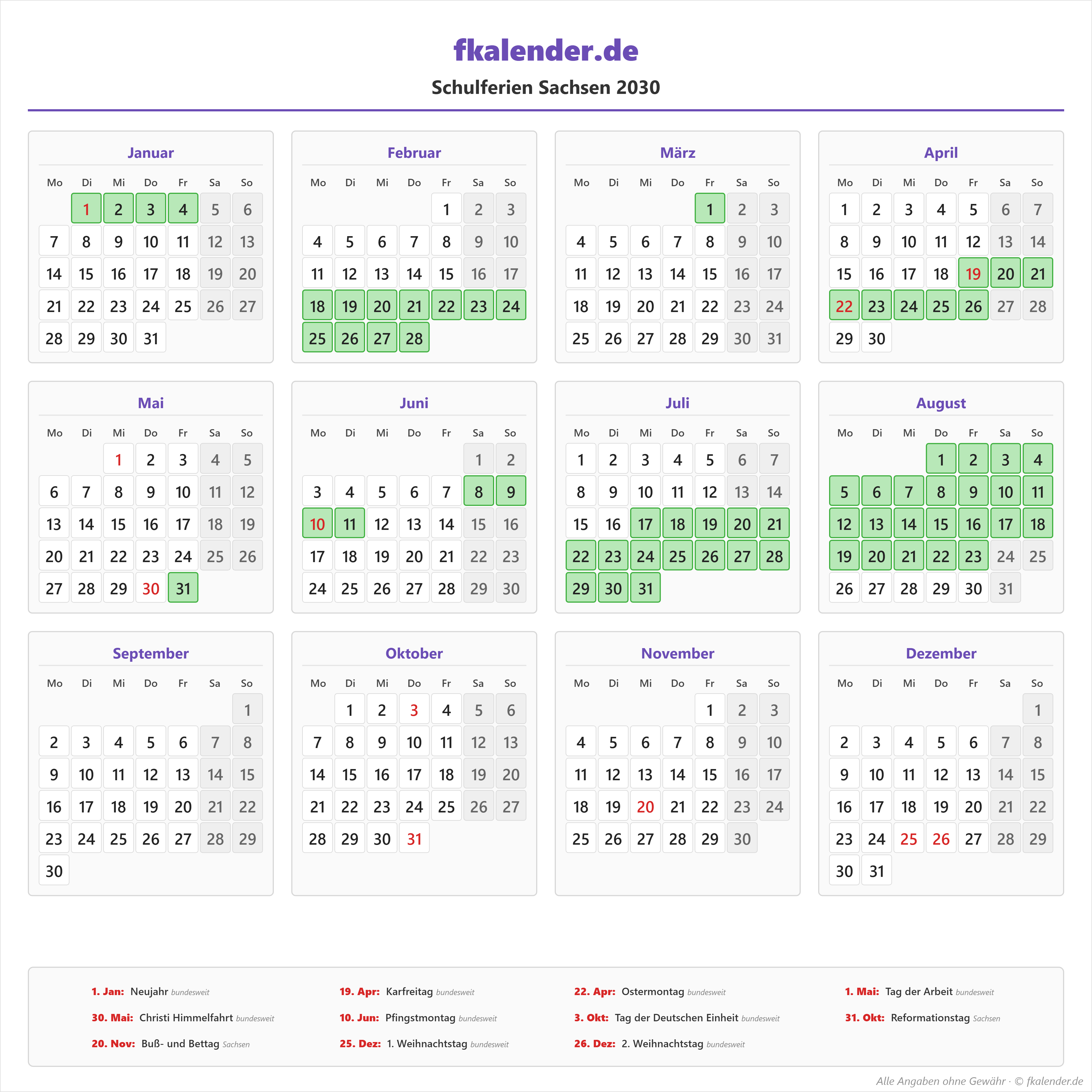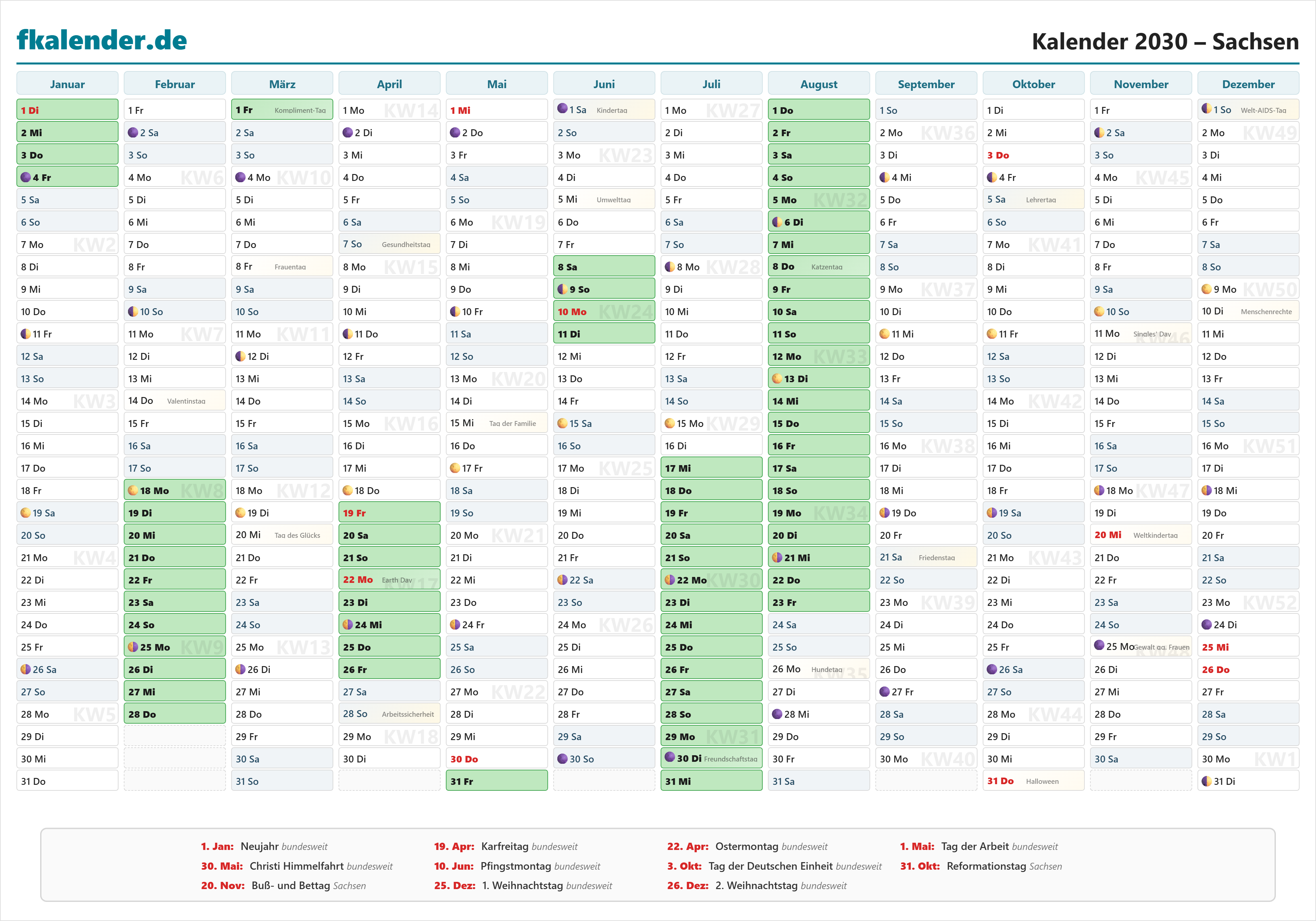 Ferienkalender Sachsen 2030 herunterladen