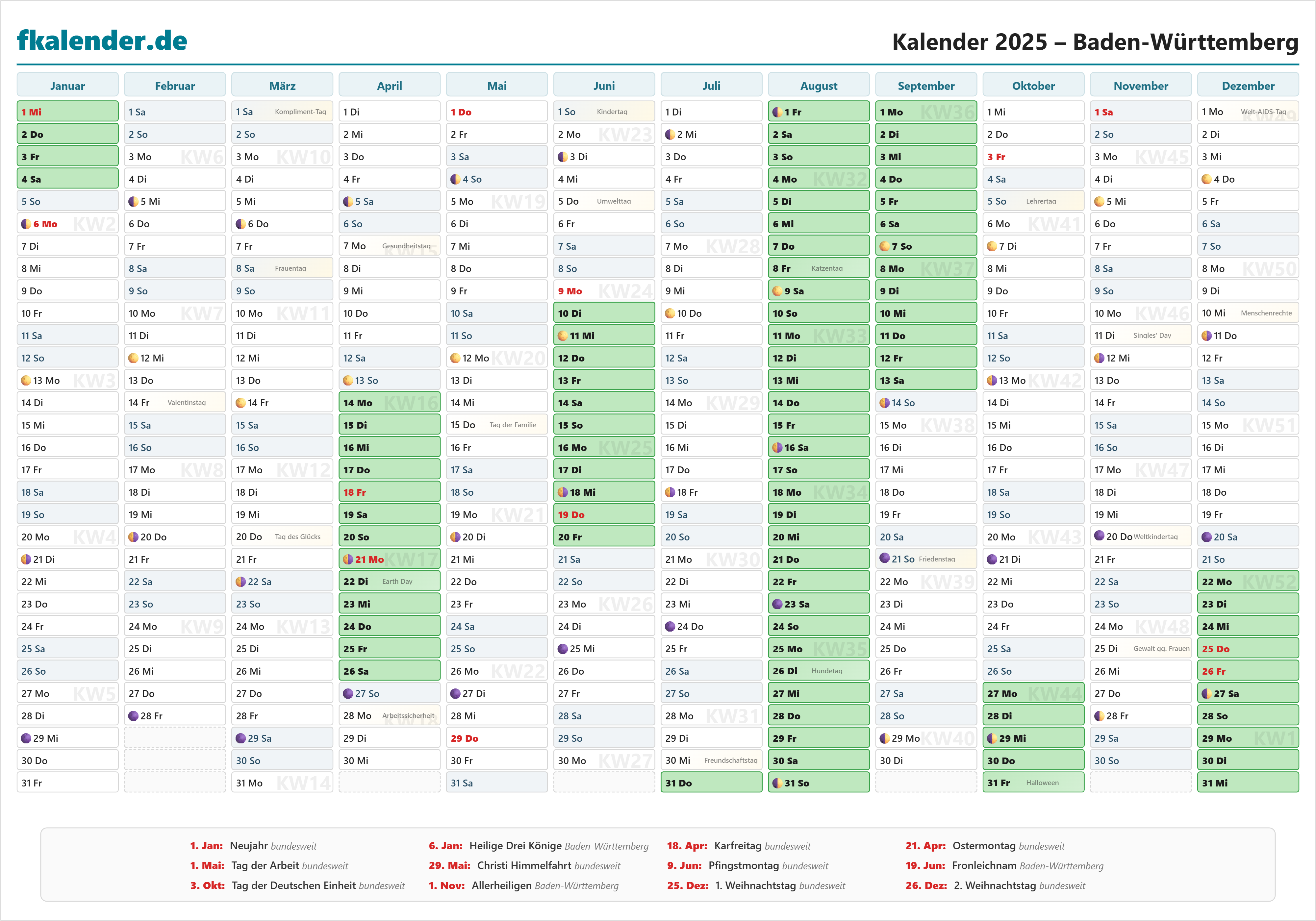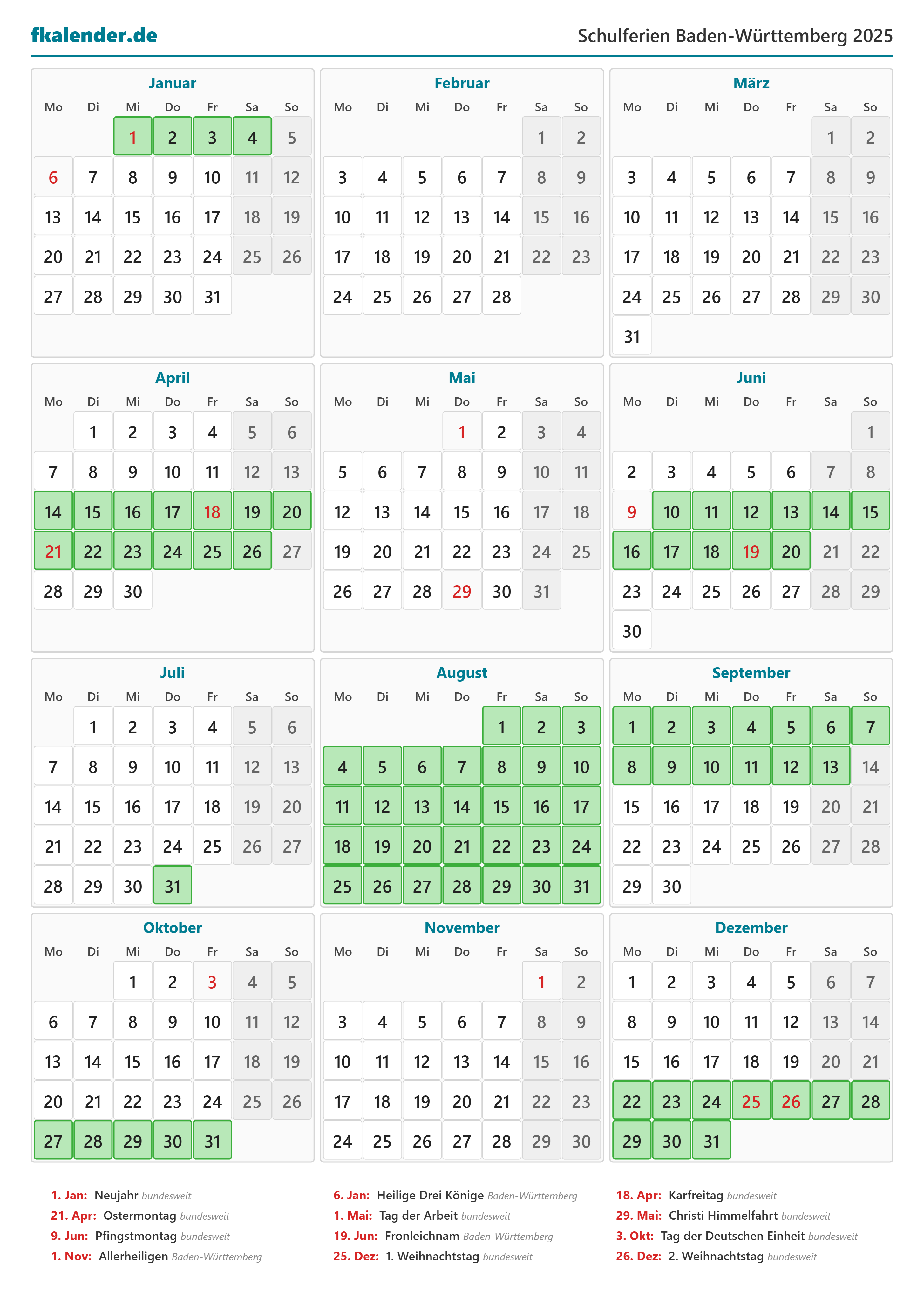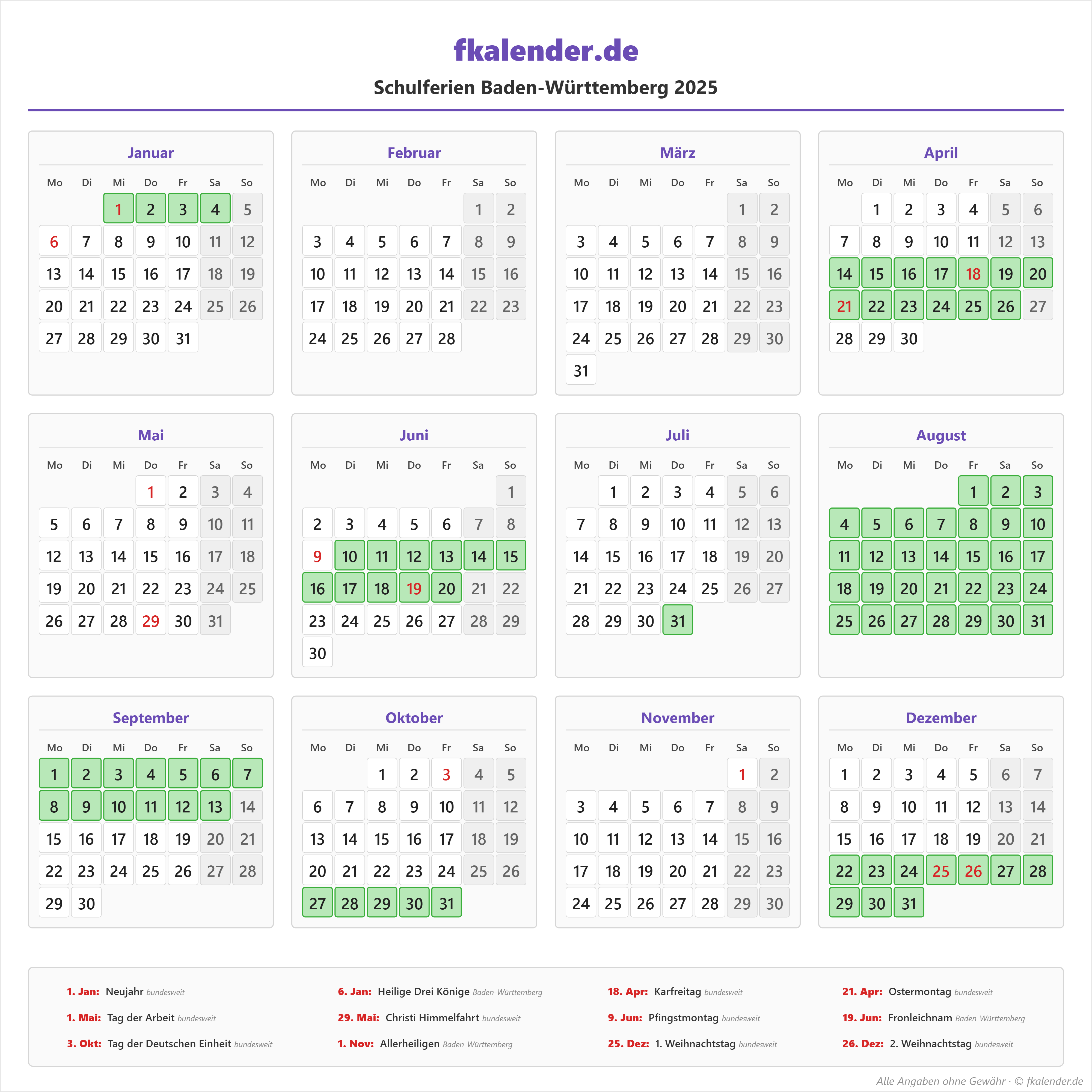 Ferienkalender Baden-Württemberg 2025 herunterladen