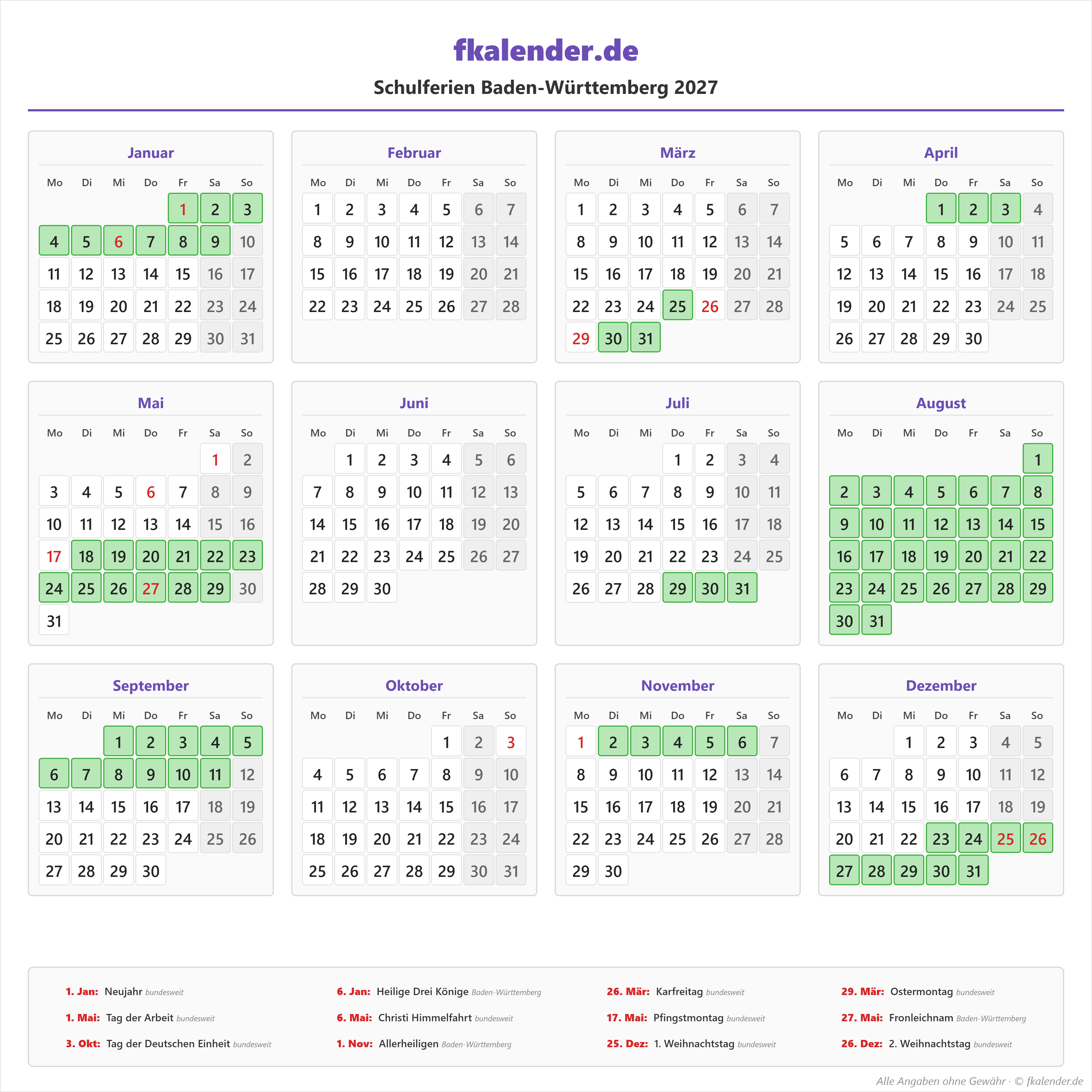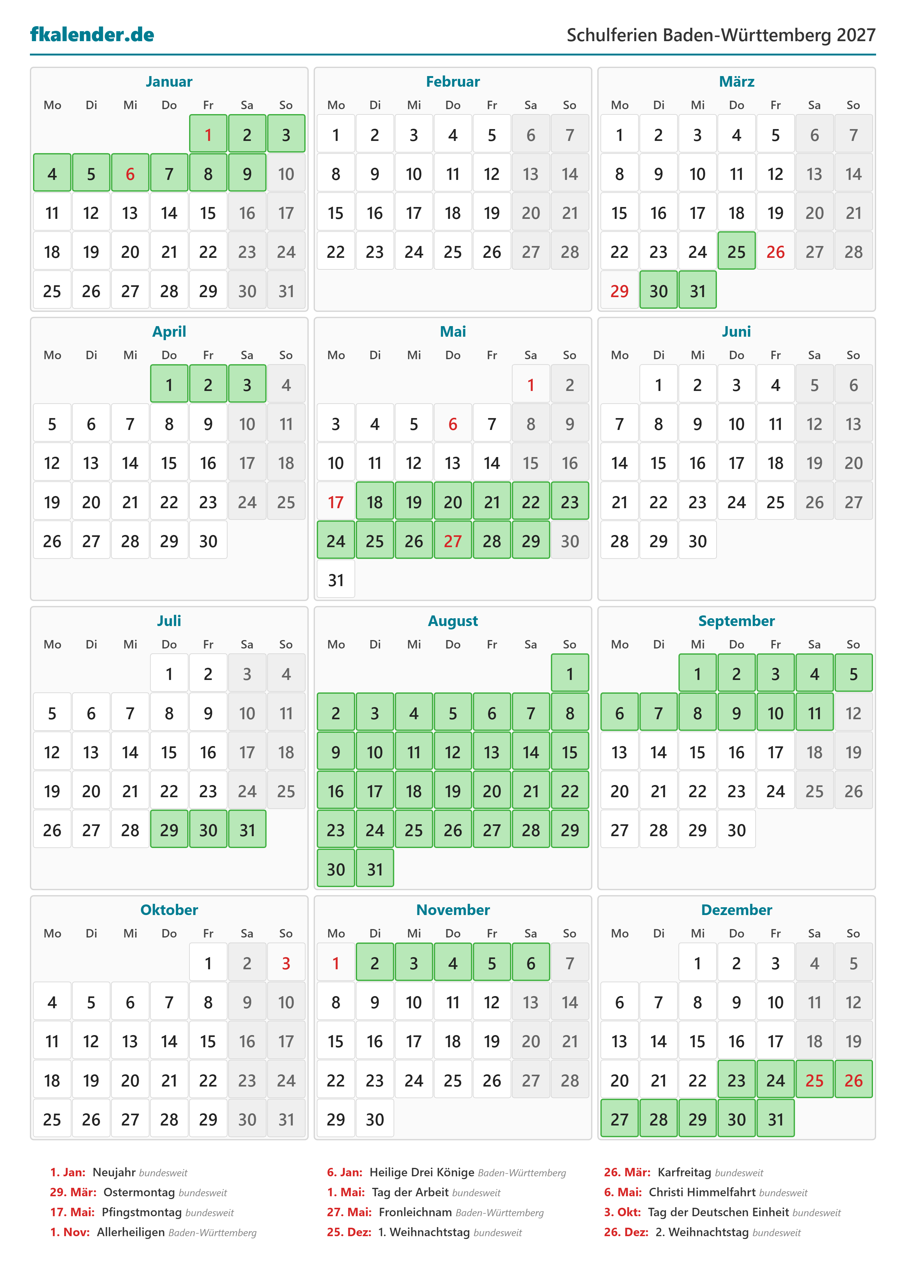 Ferienkalender Baden-Württemberg 2027 herunterladen