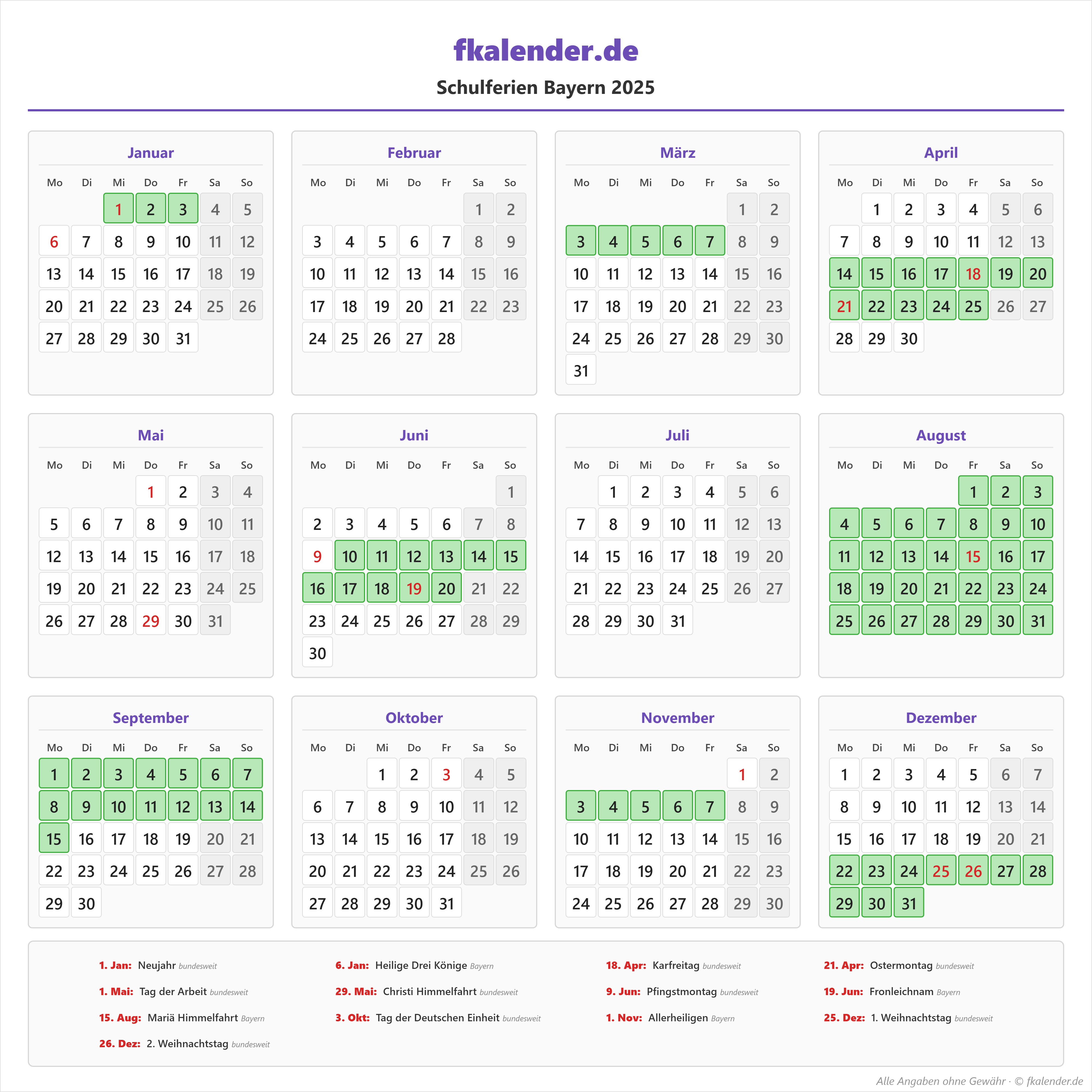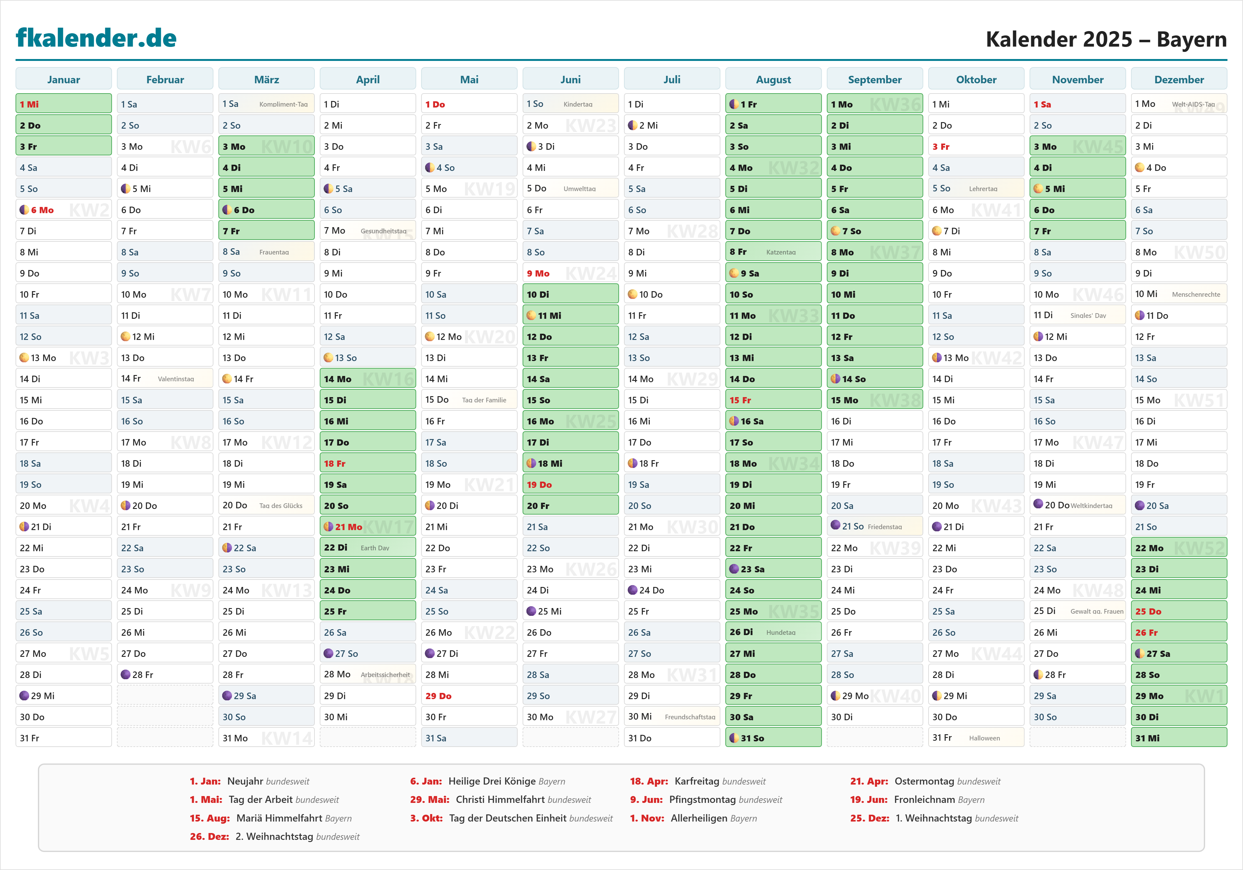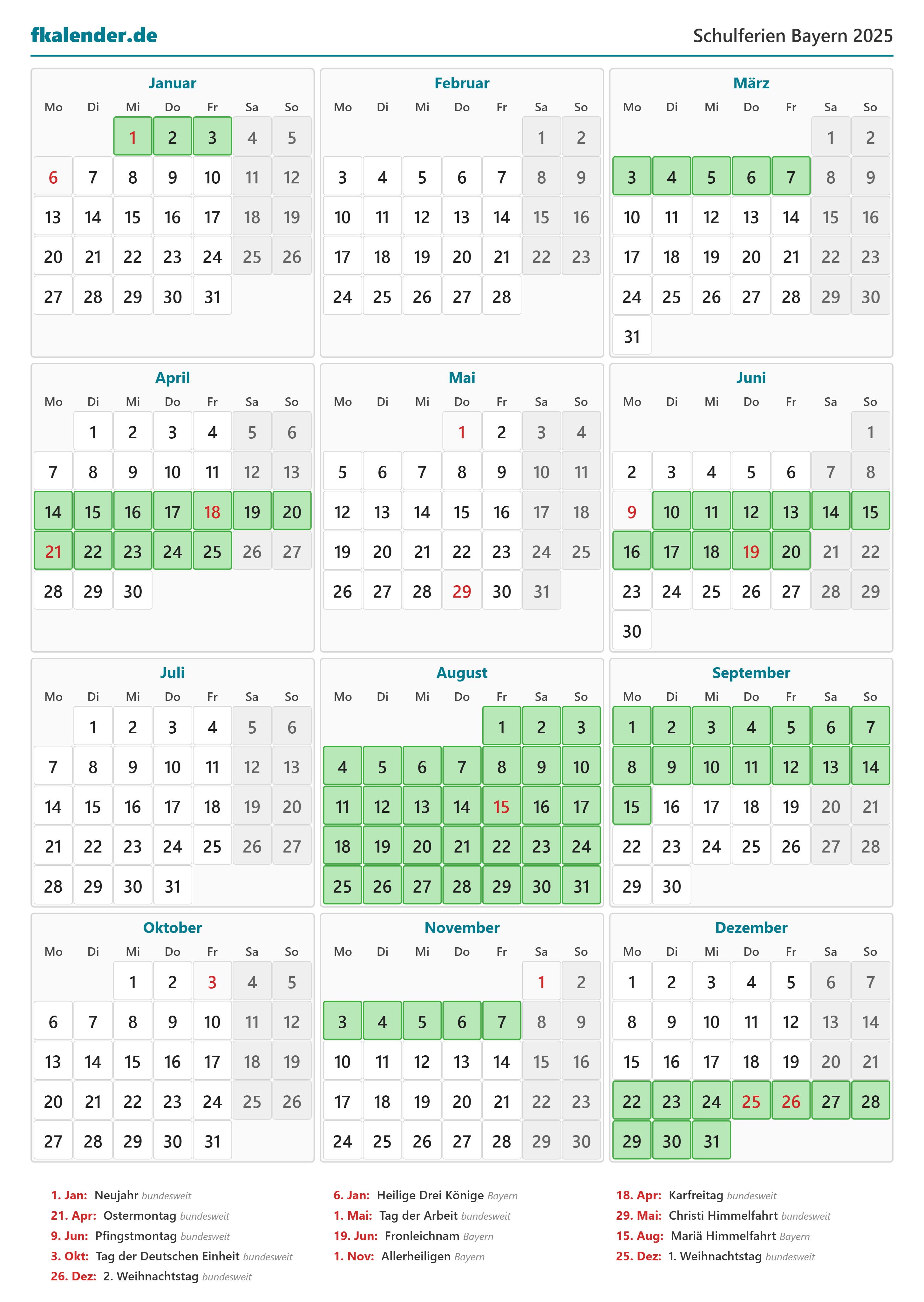Ferienkalender Bayern 2025 herunterladen