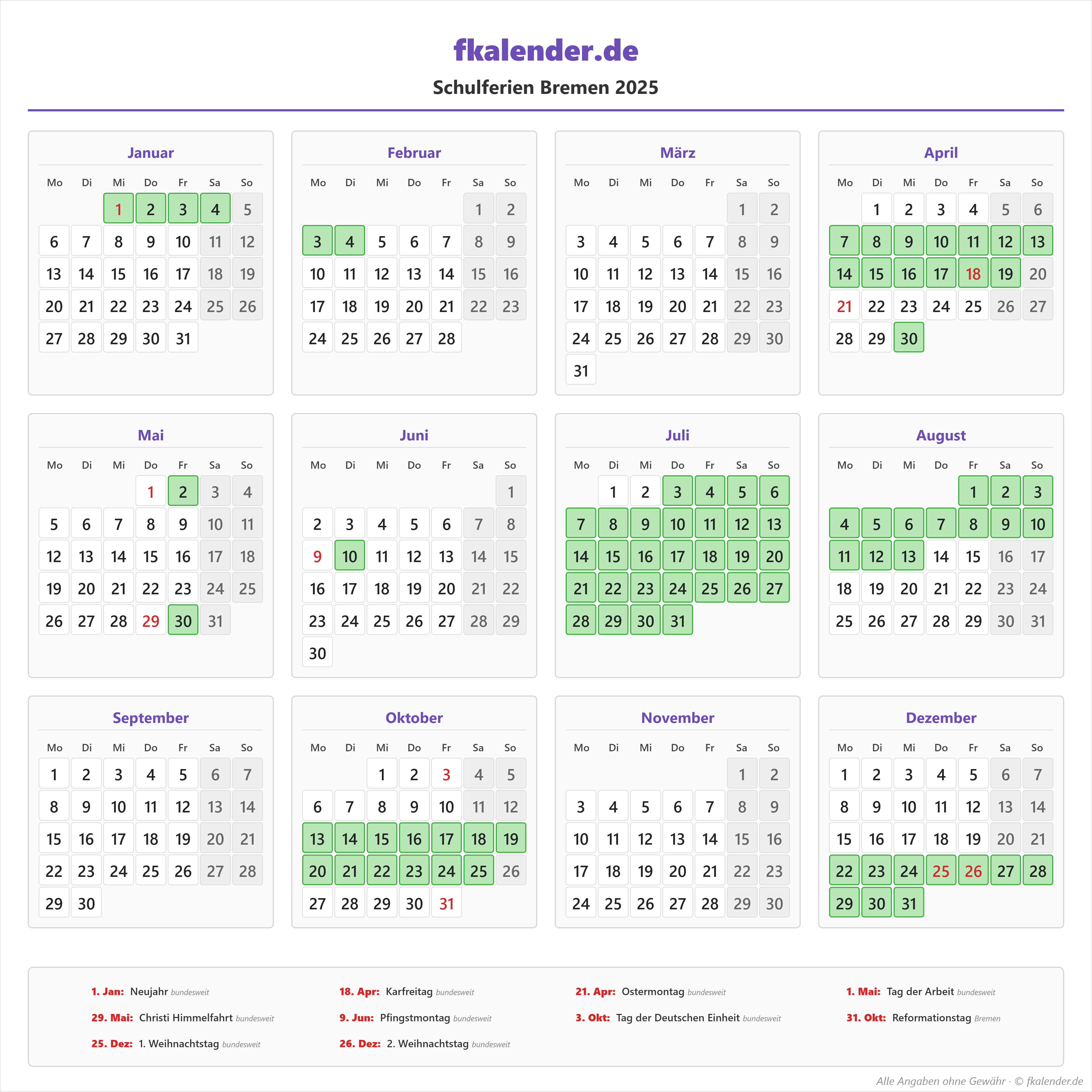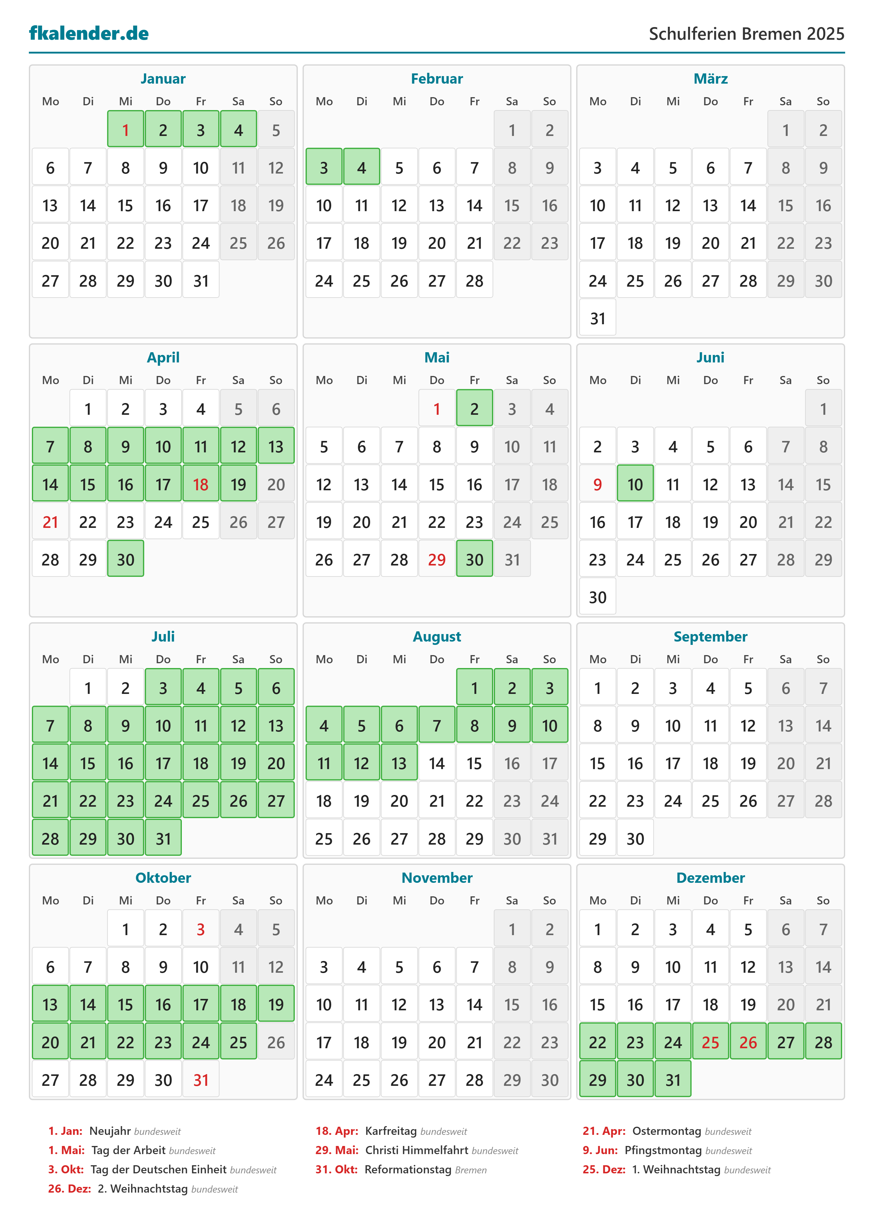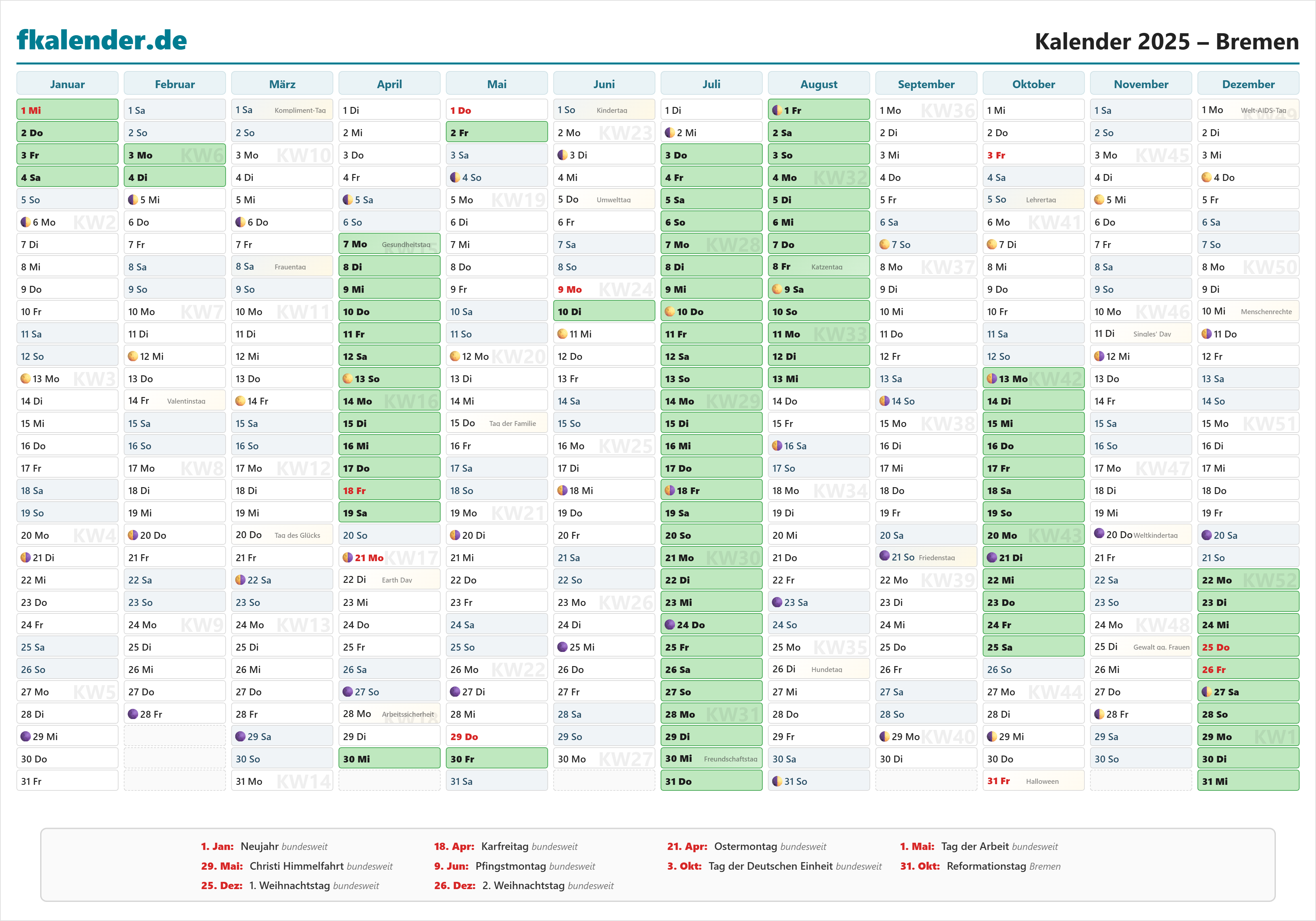 Ferienkalender Bremen 2025 herunterladen
