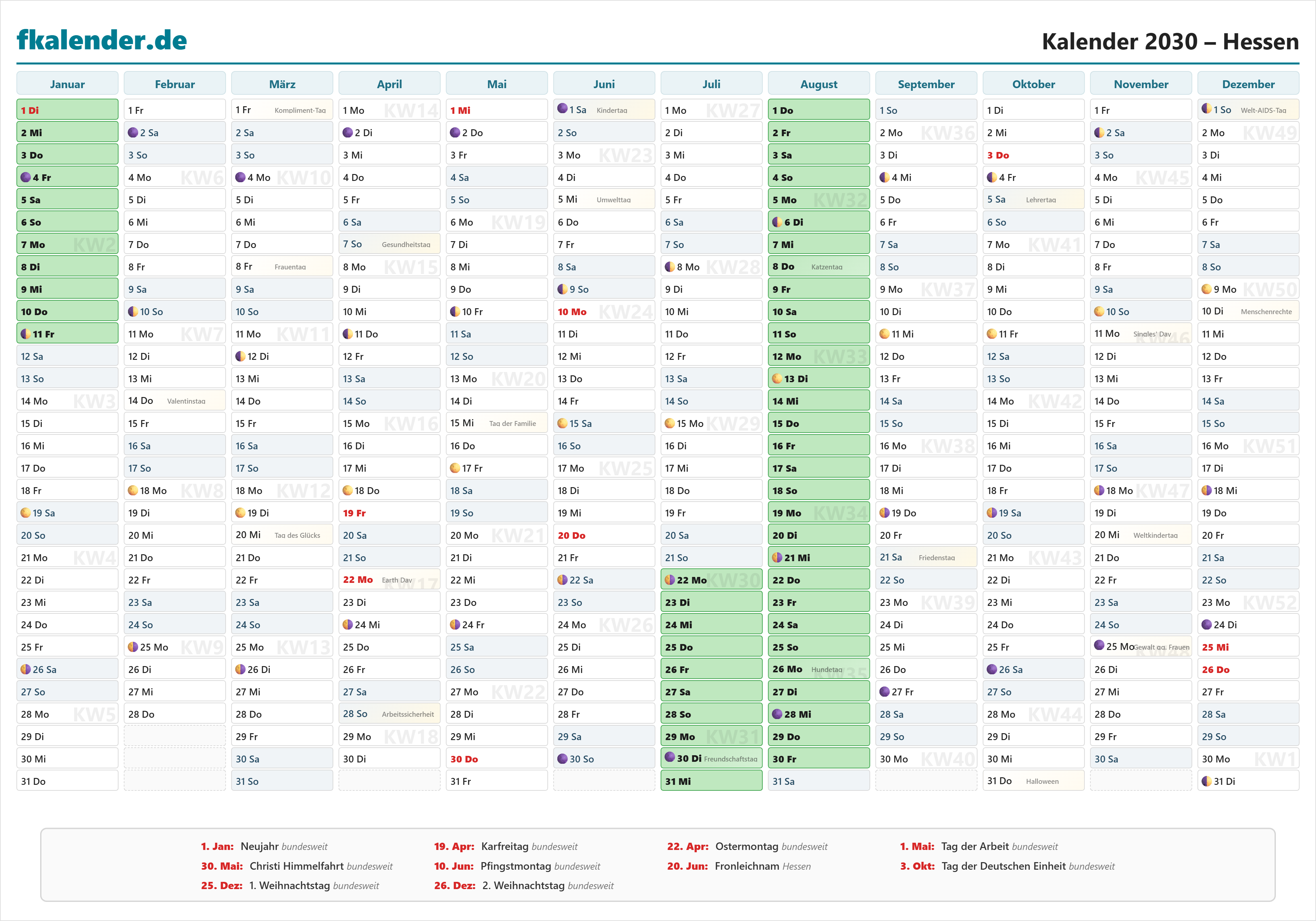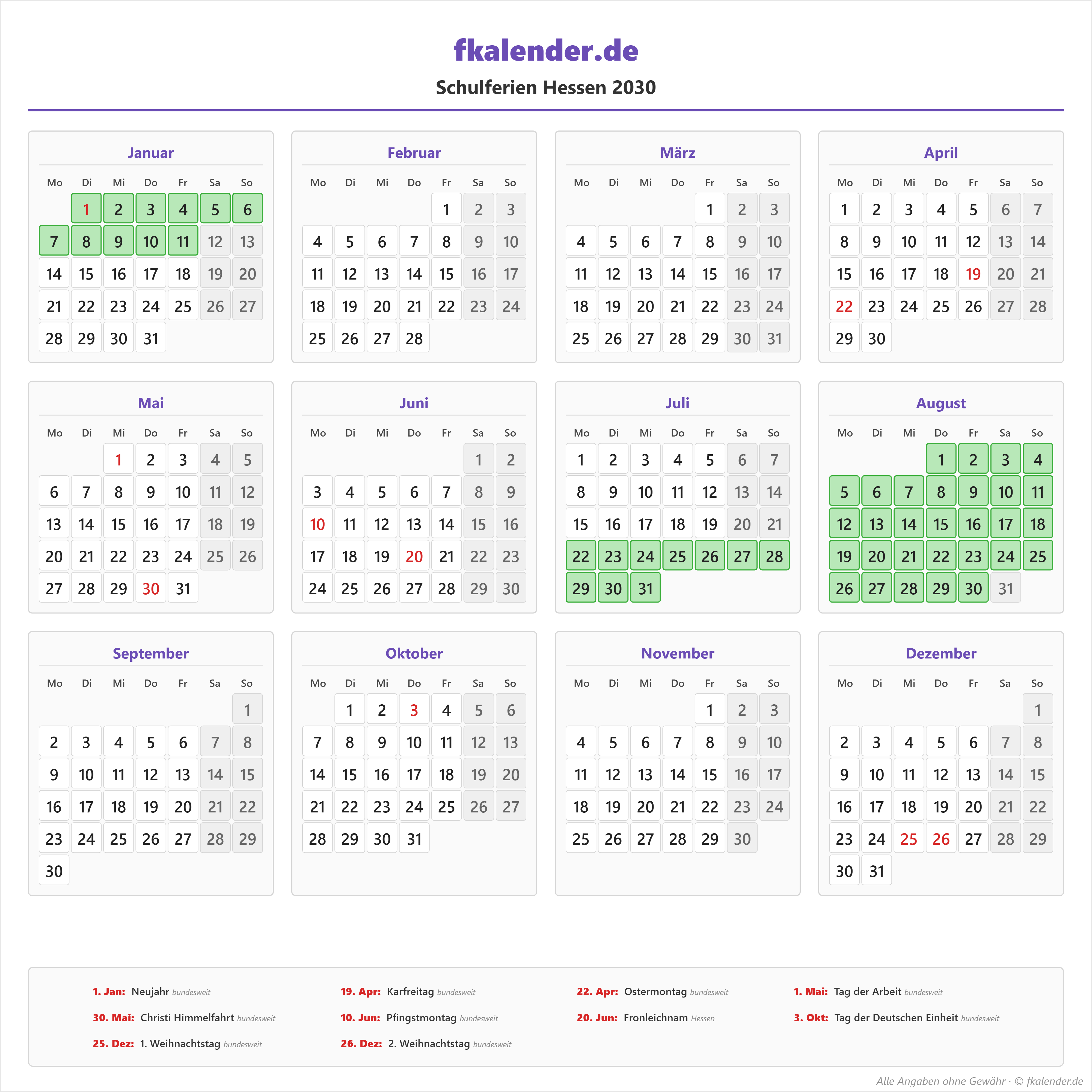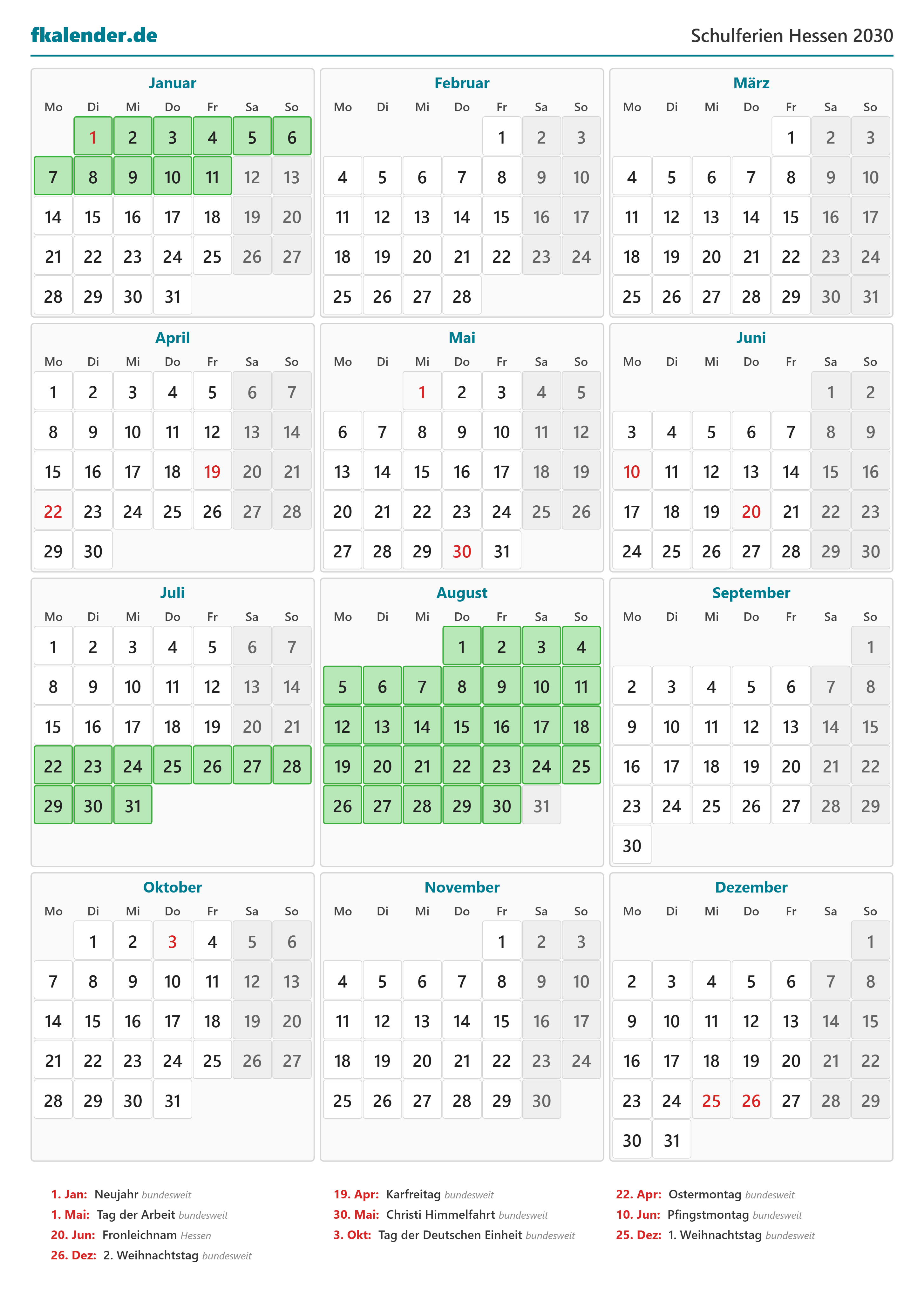 - Sommerferien: 22.07.2030 - 30.08.2030