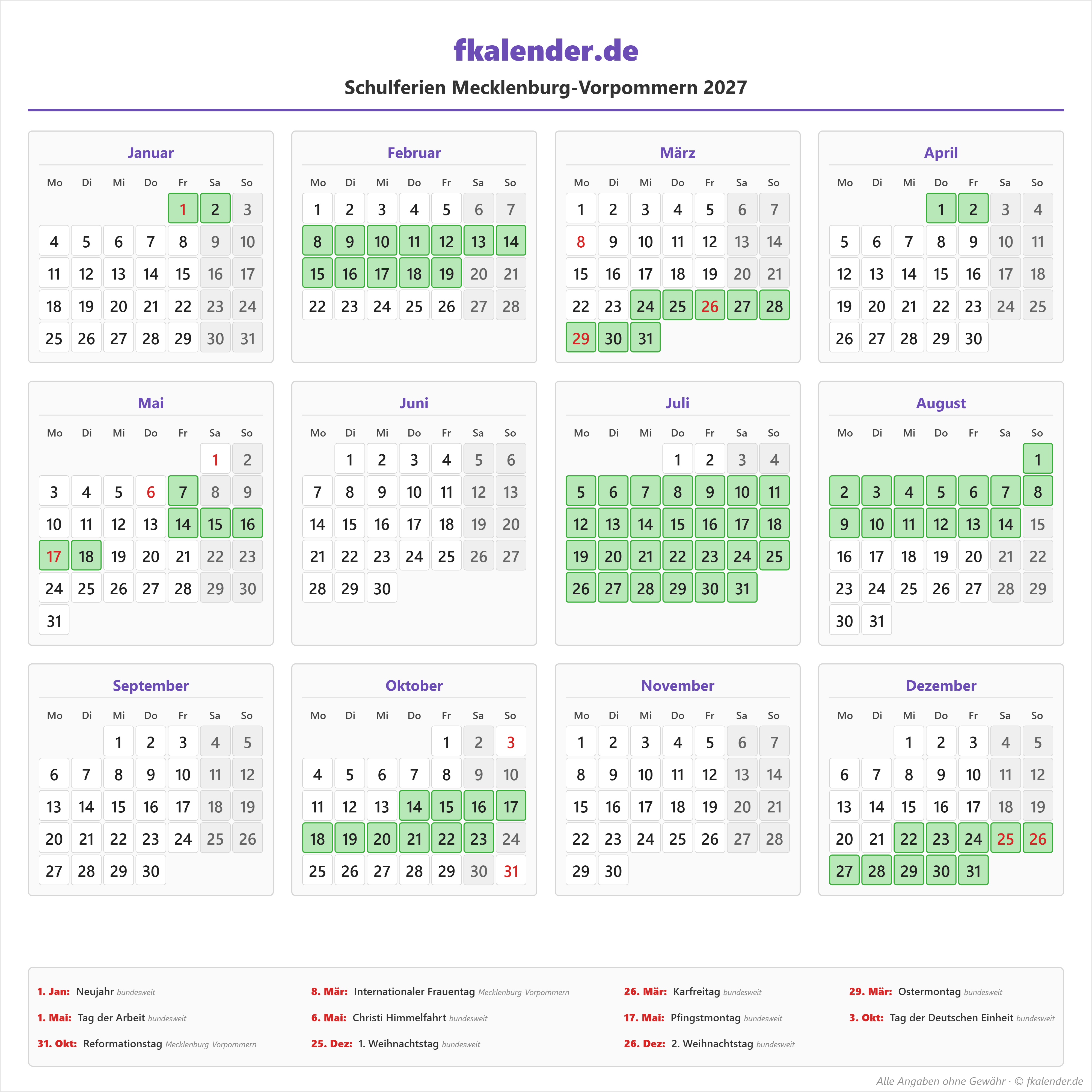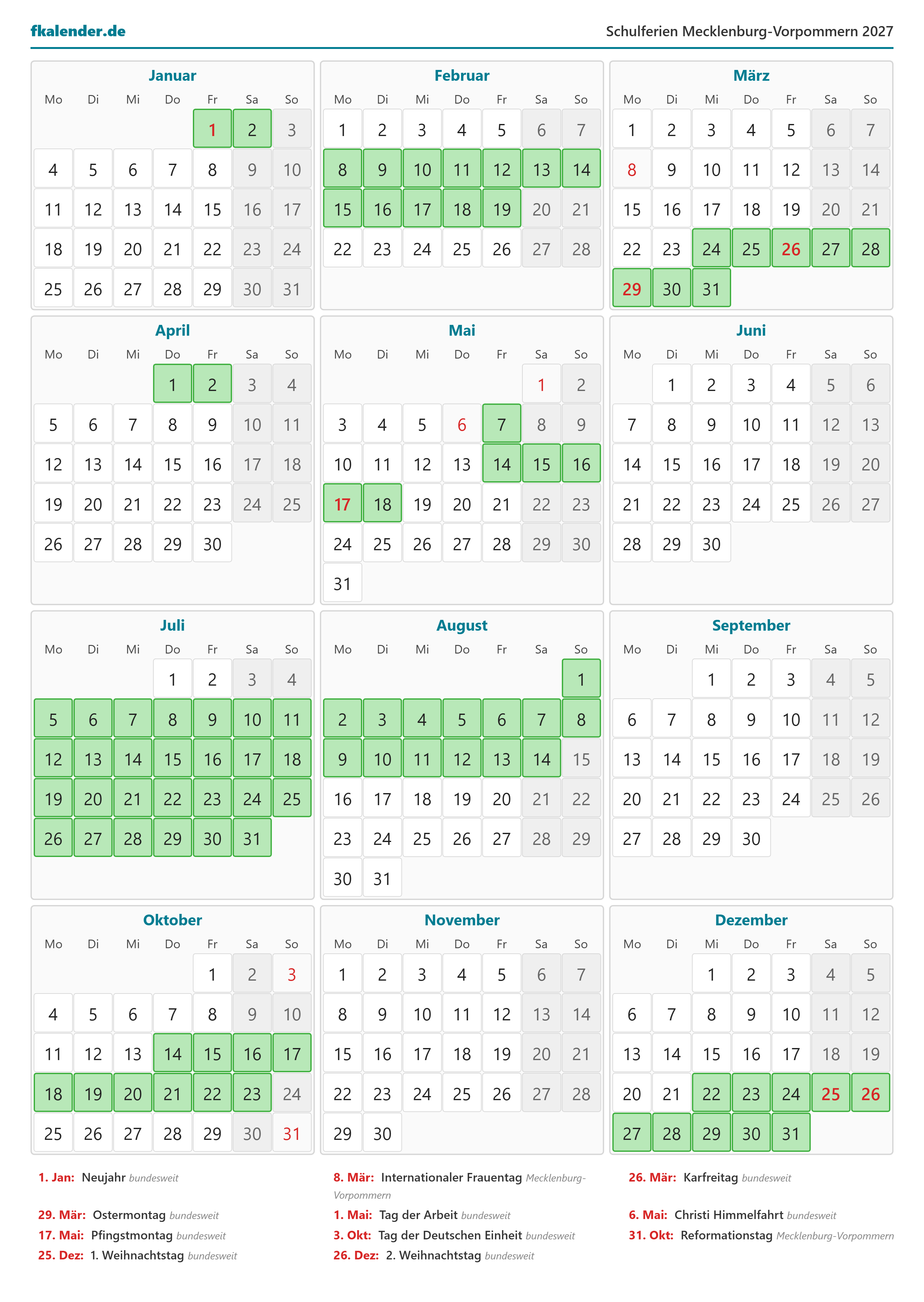 Ferienkalender Mecklenburg-Vorpommern 2027 herunterladen