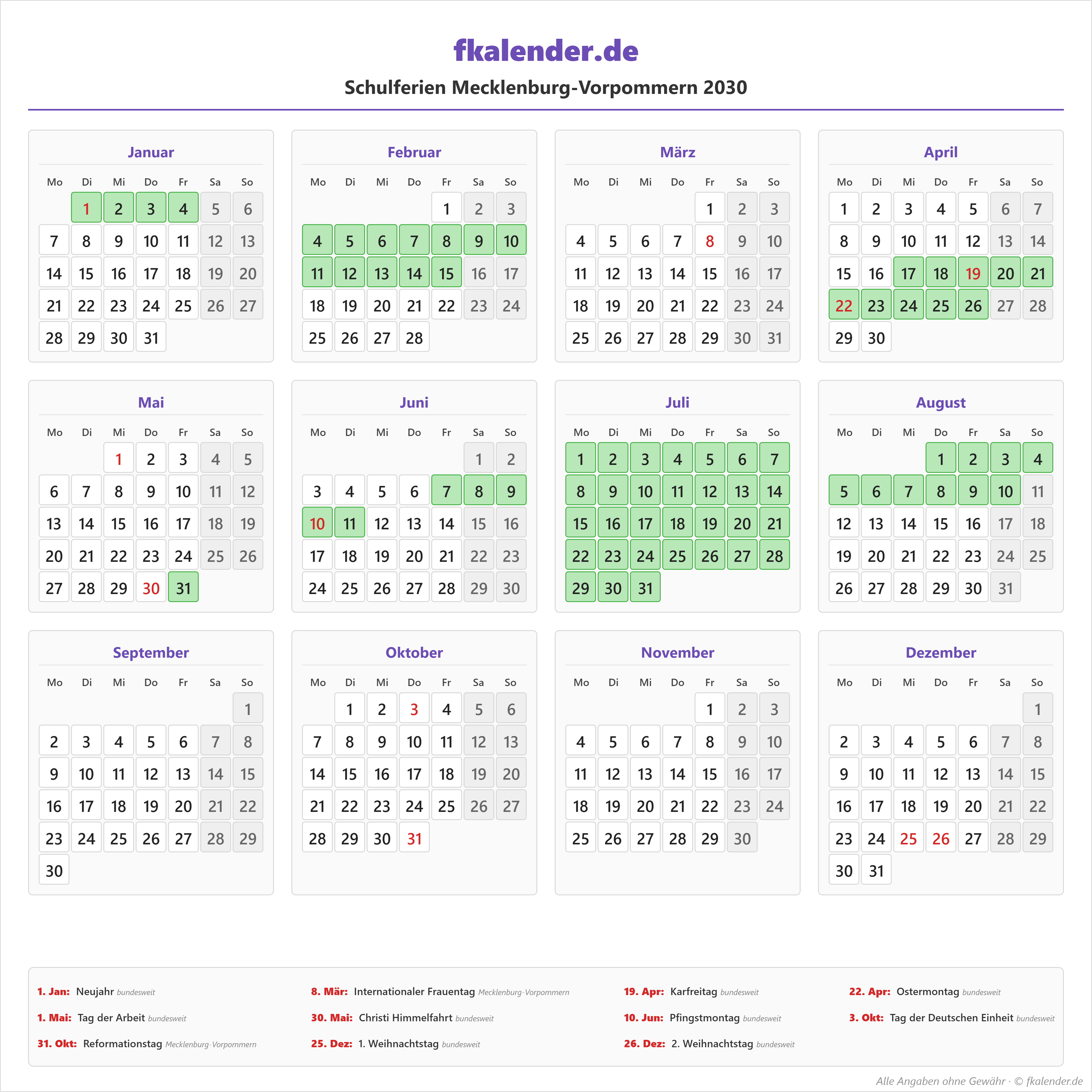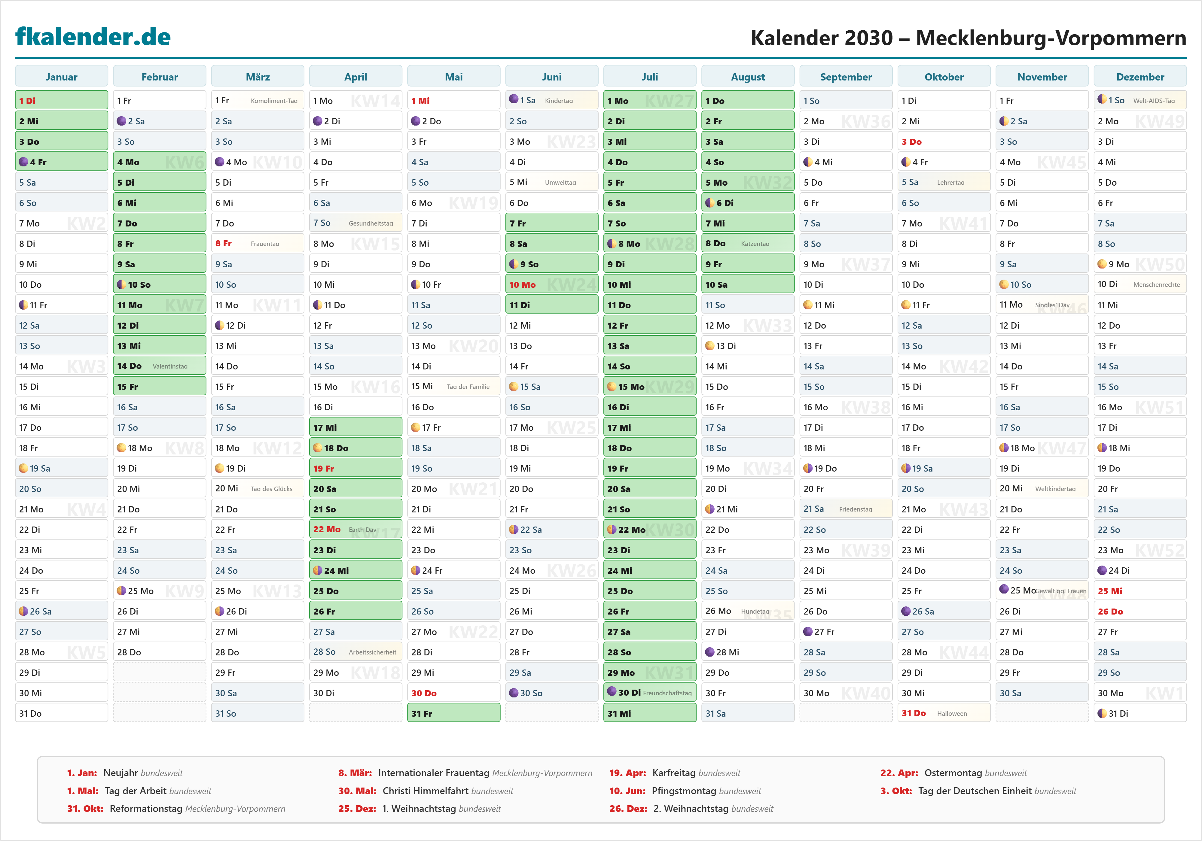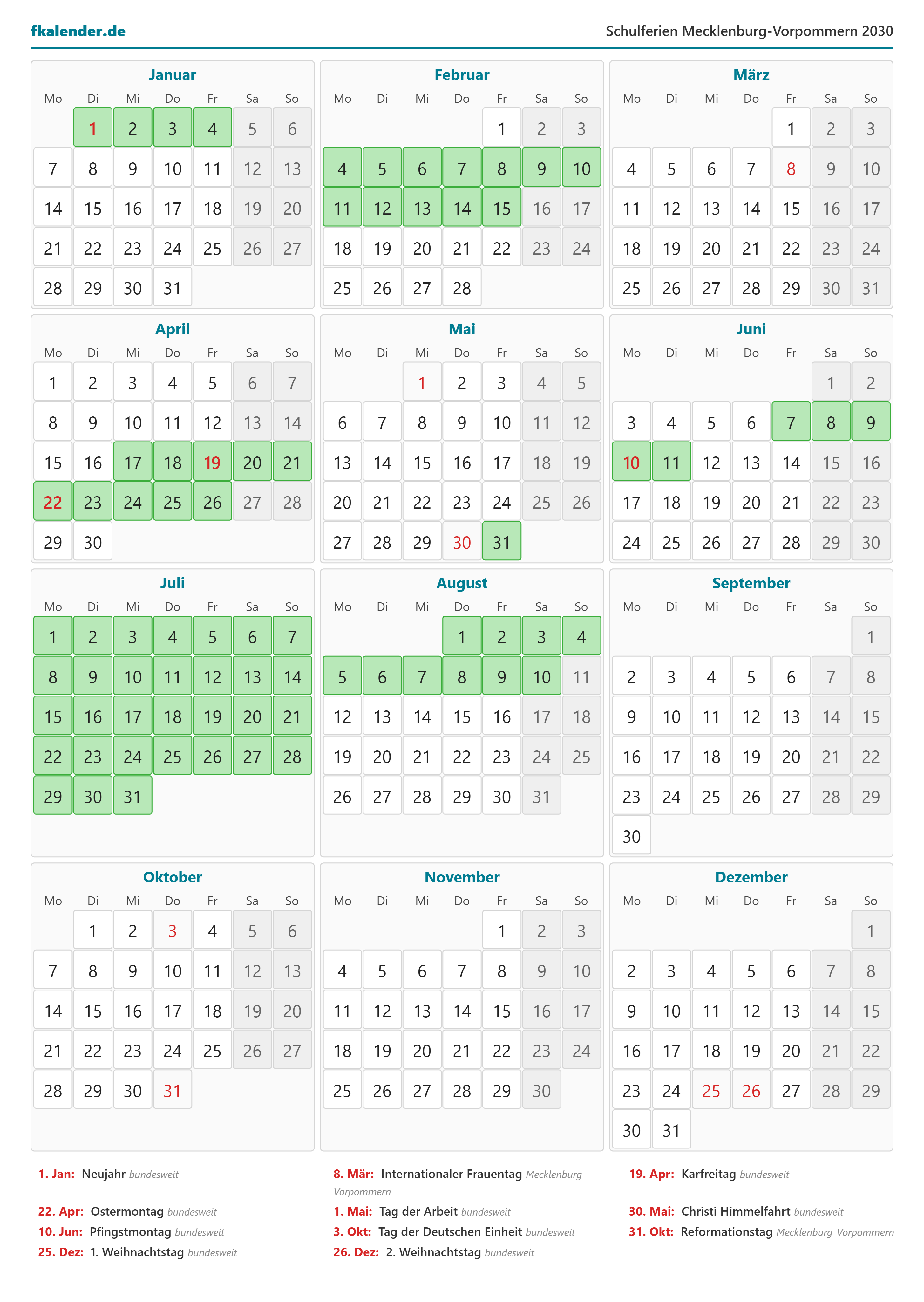 Ferienkalender Mecklenburg-Vorpommern 2030 herunterladen