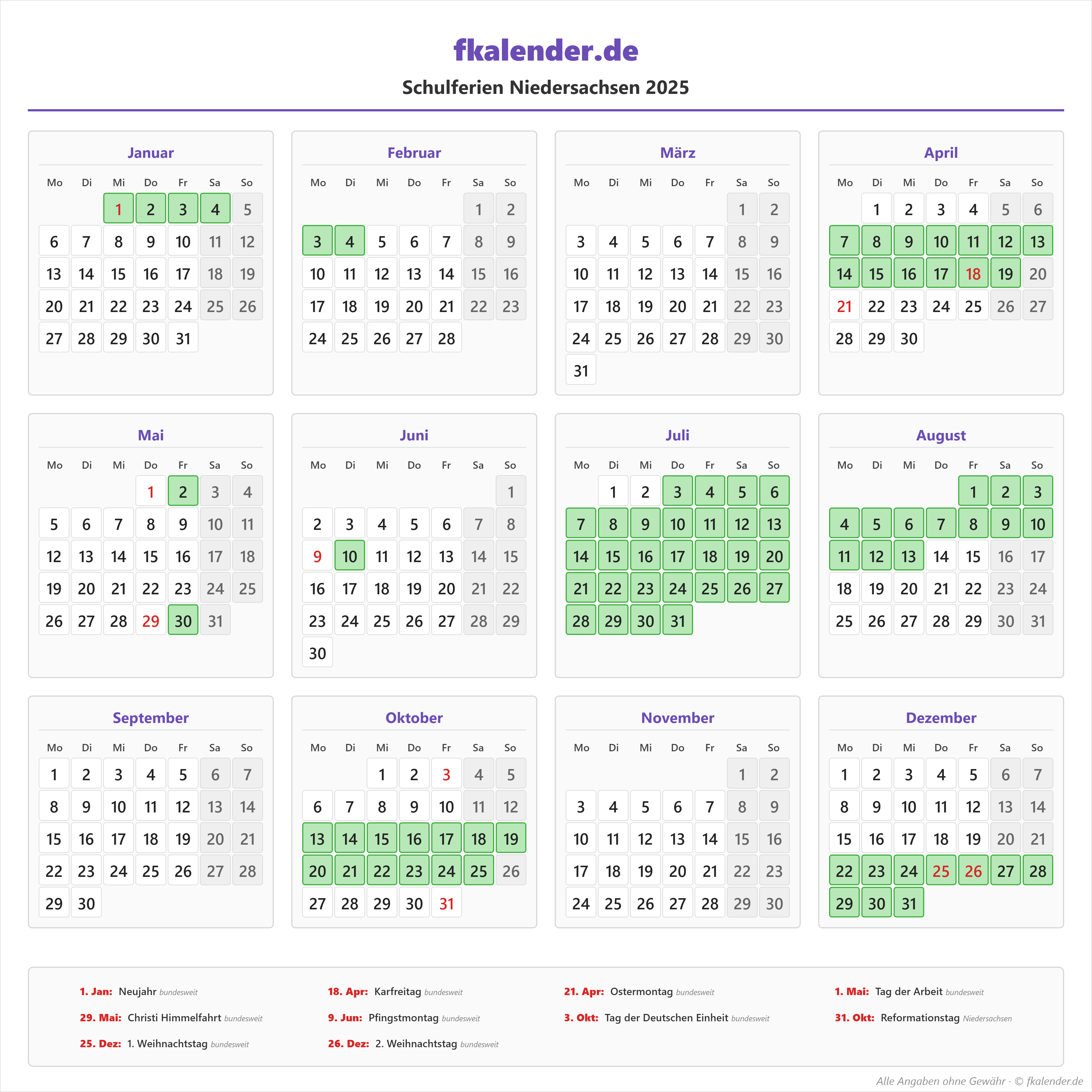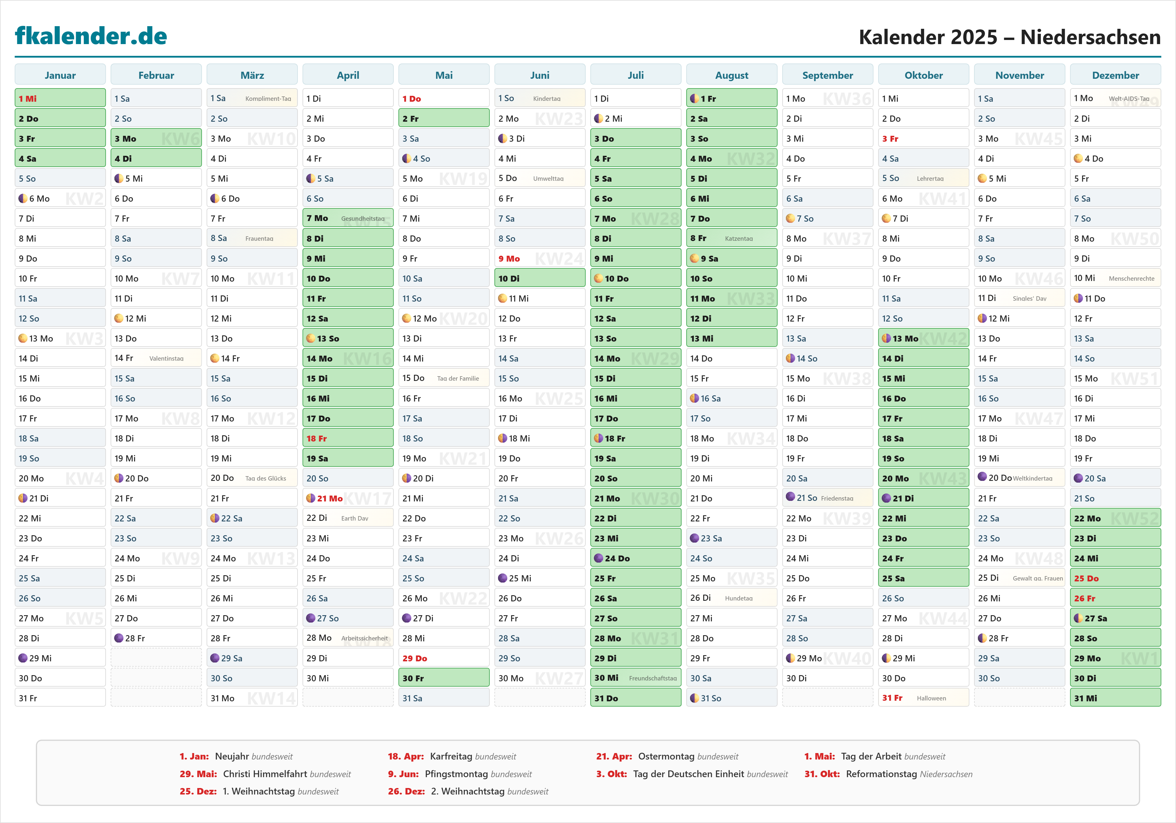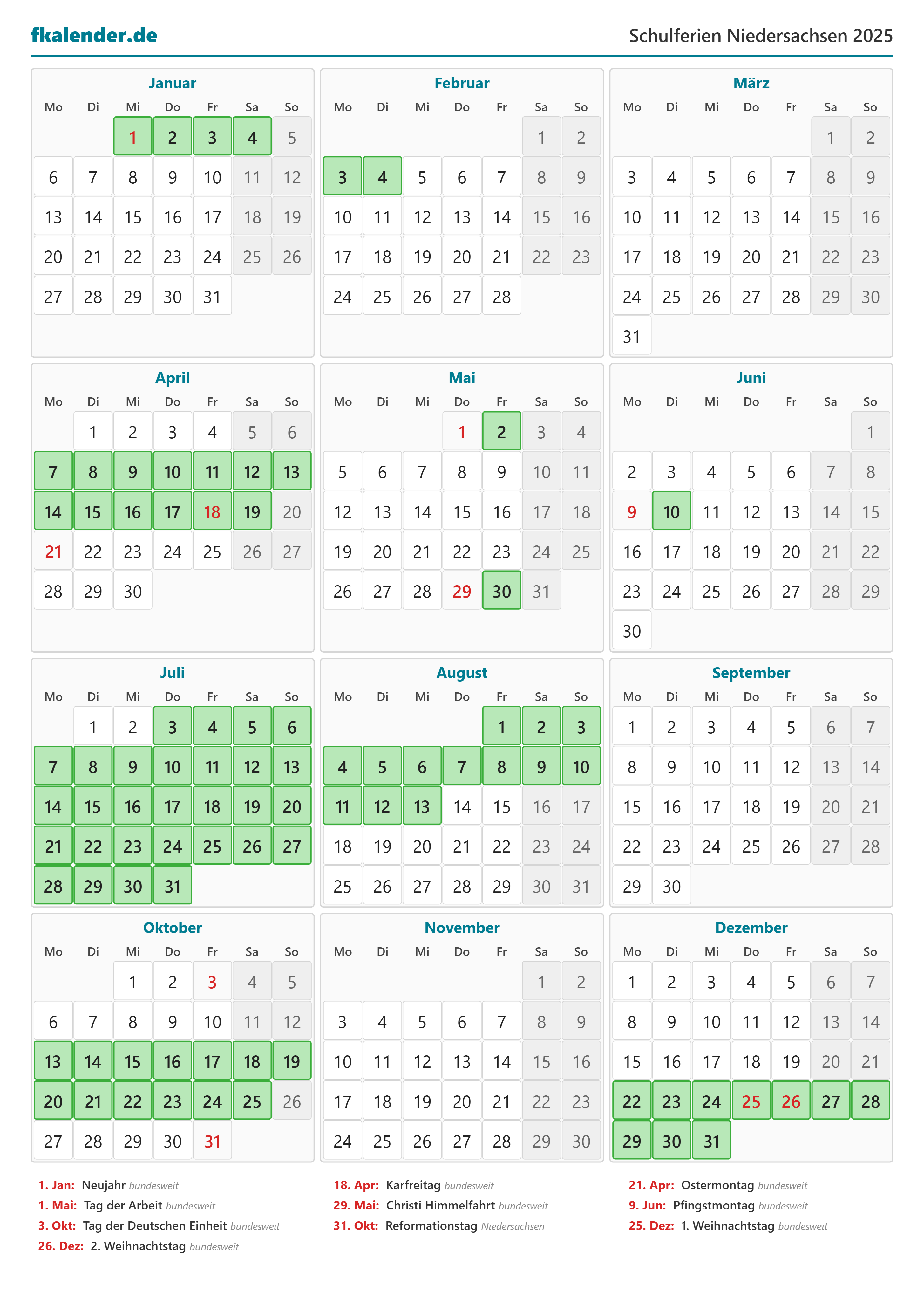 Ferienkalender Niedersachsen 2025 herunterladen