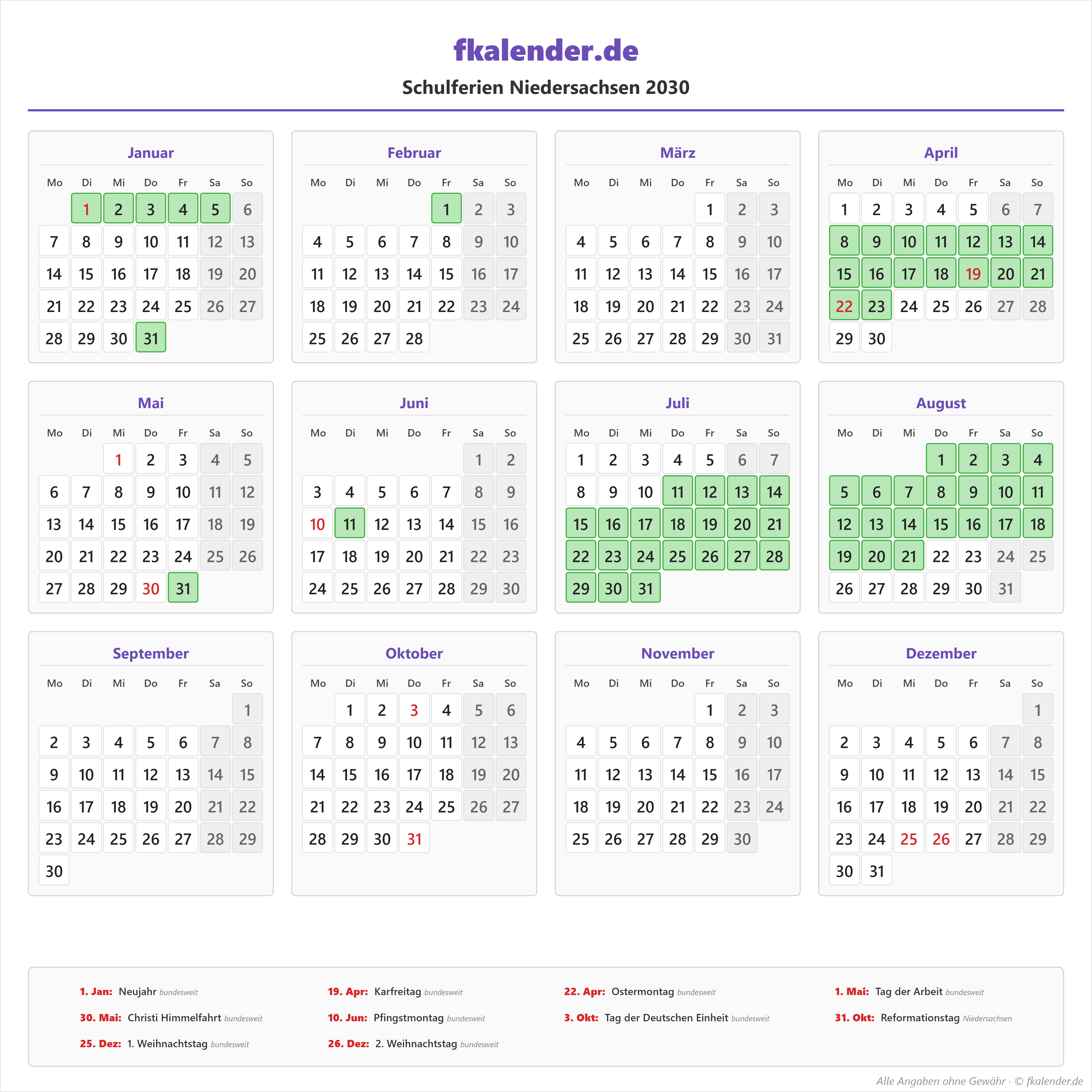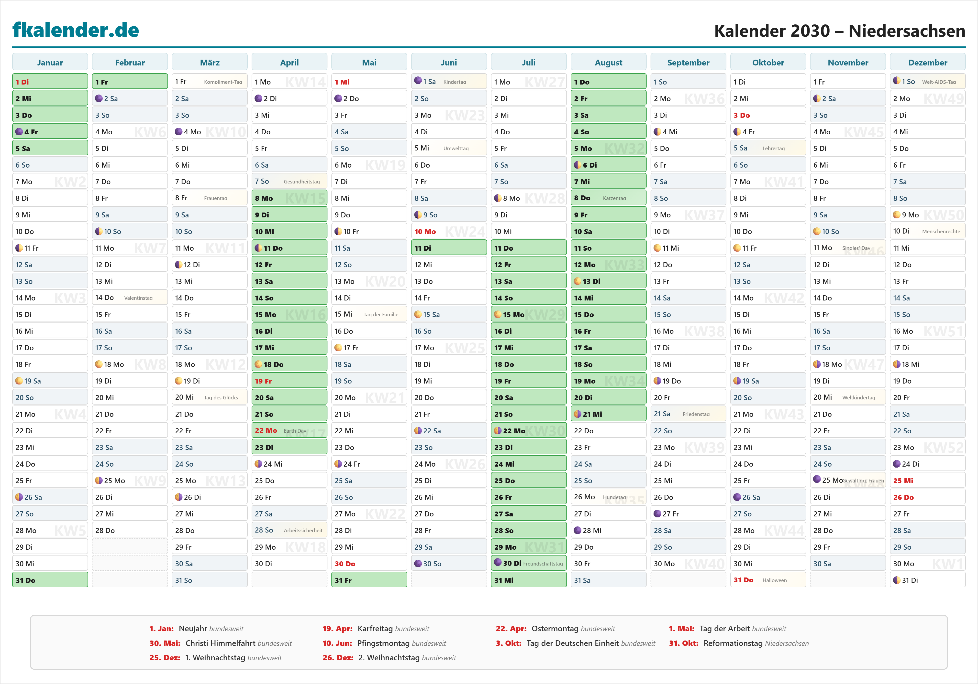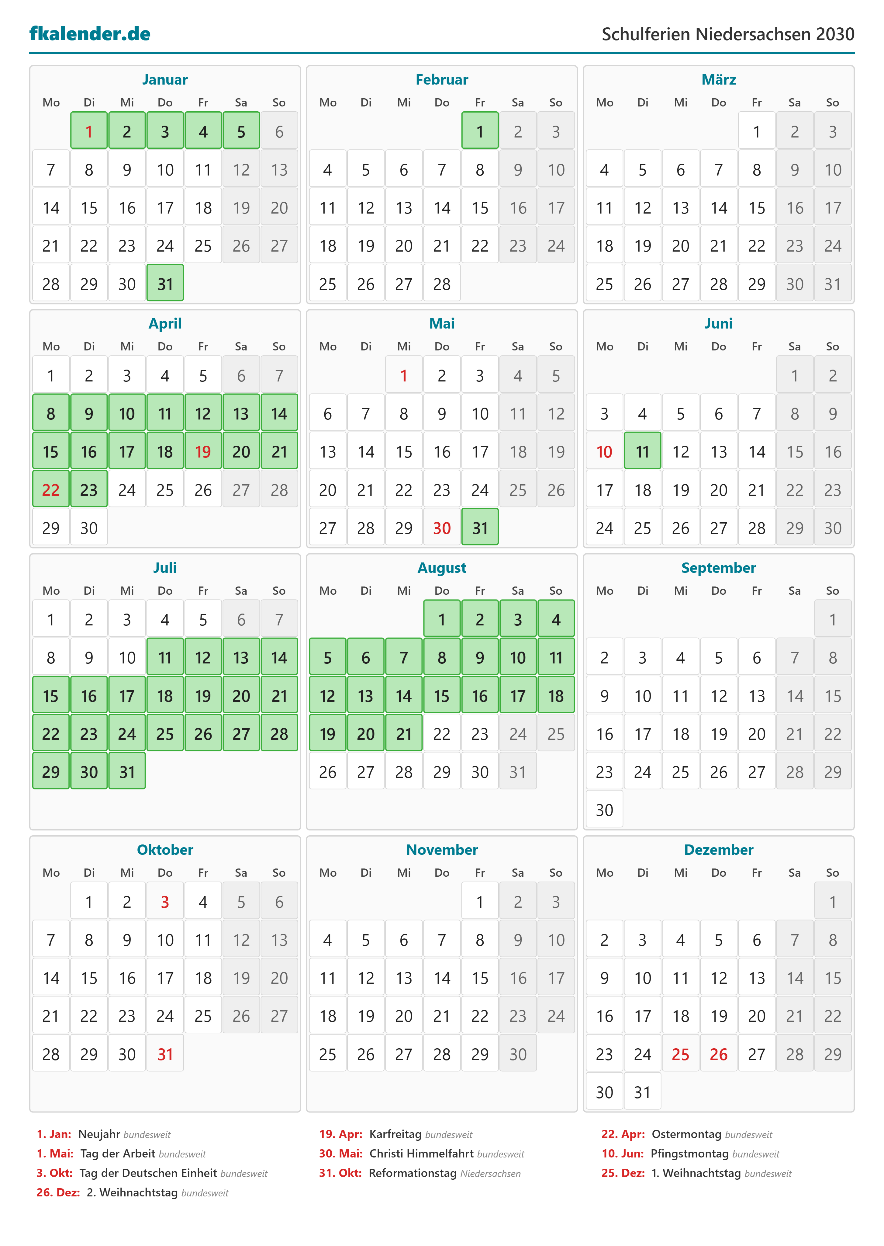 Ferienkalender Niedersachsen 2030 herunterladen
