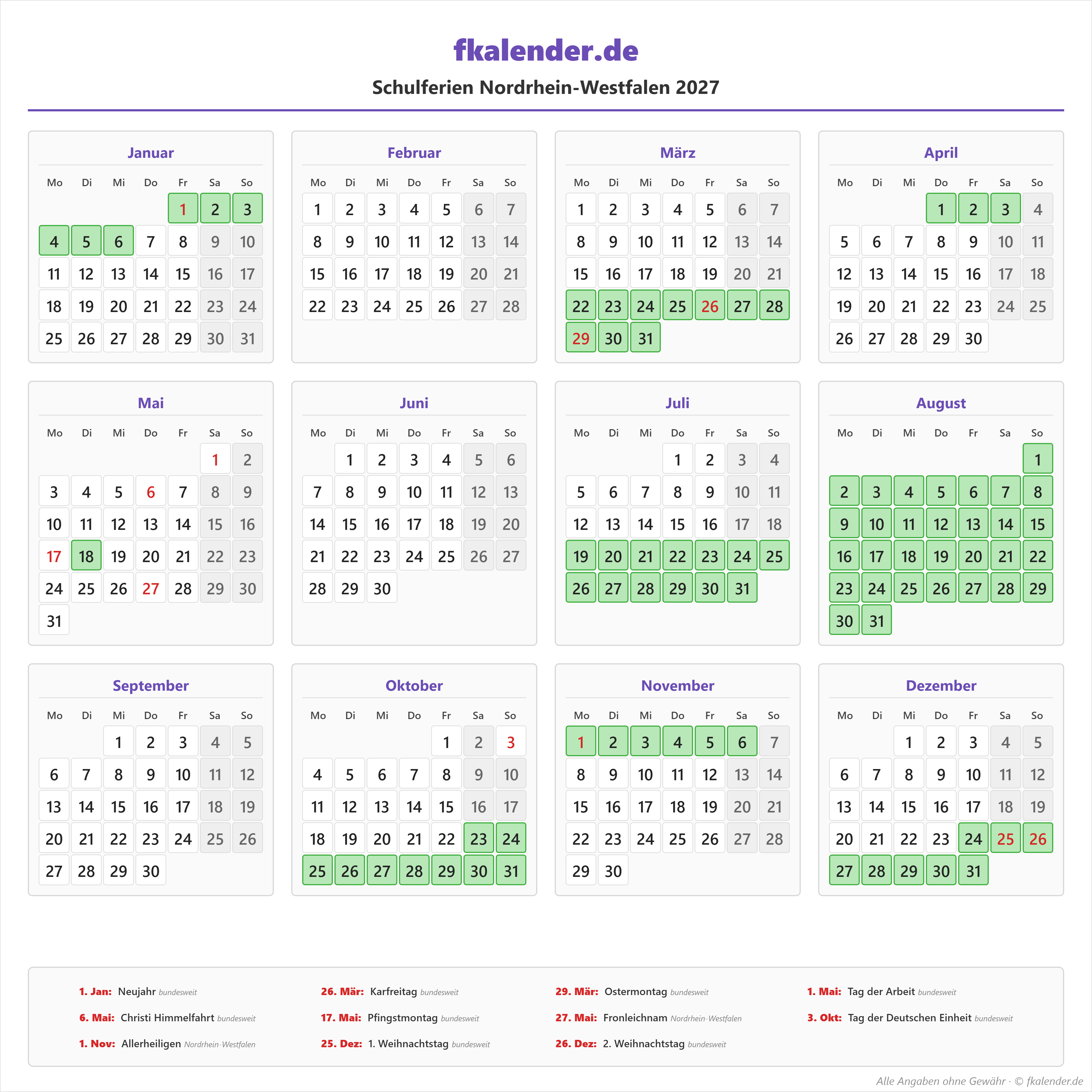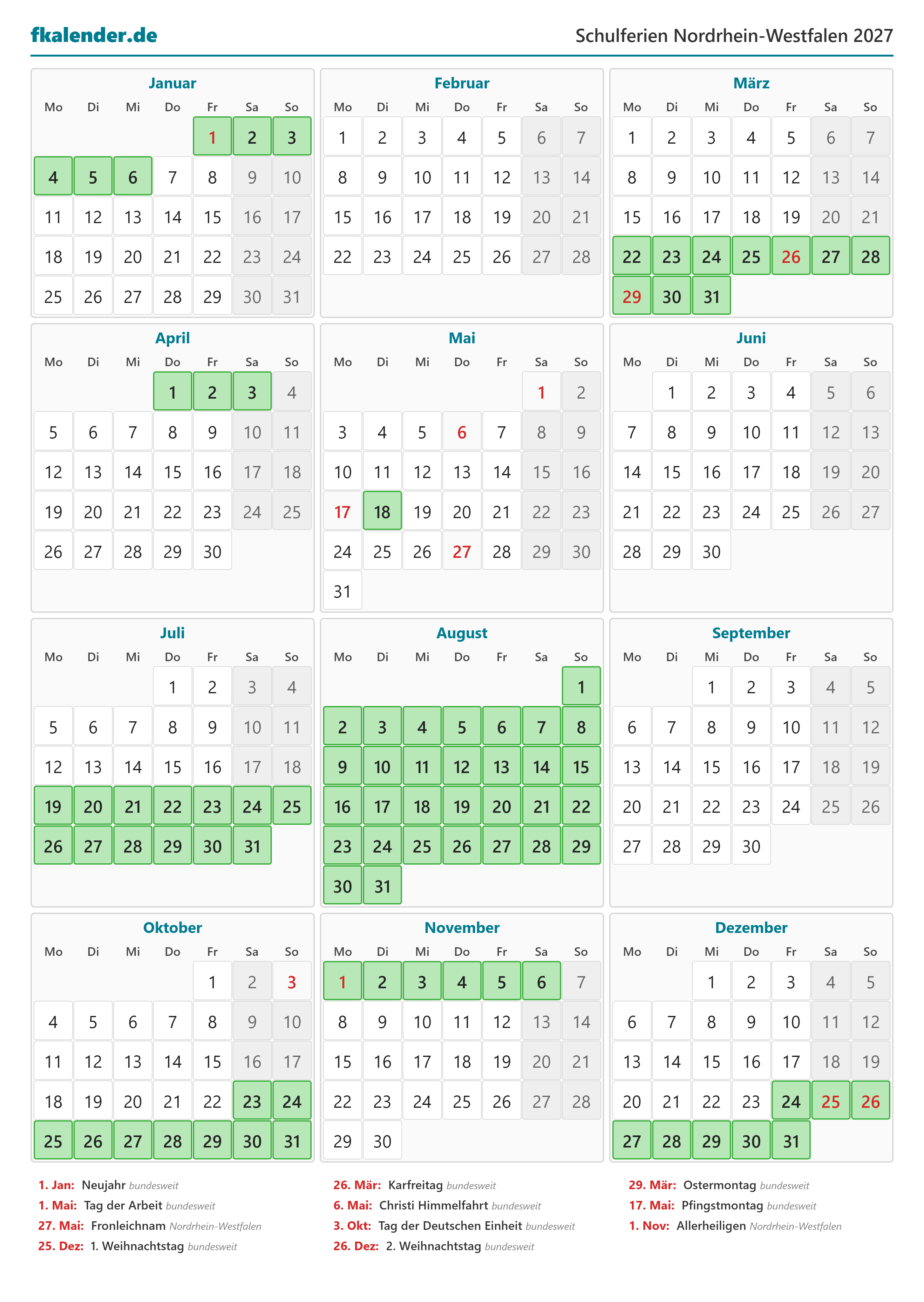 Ferienkalender Nordrhein-Westfalen 2027 herunterladen