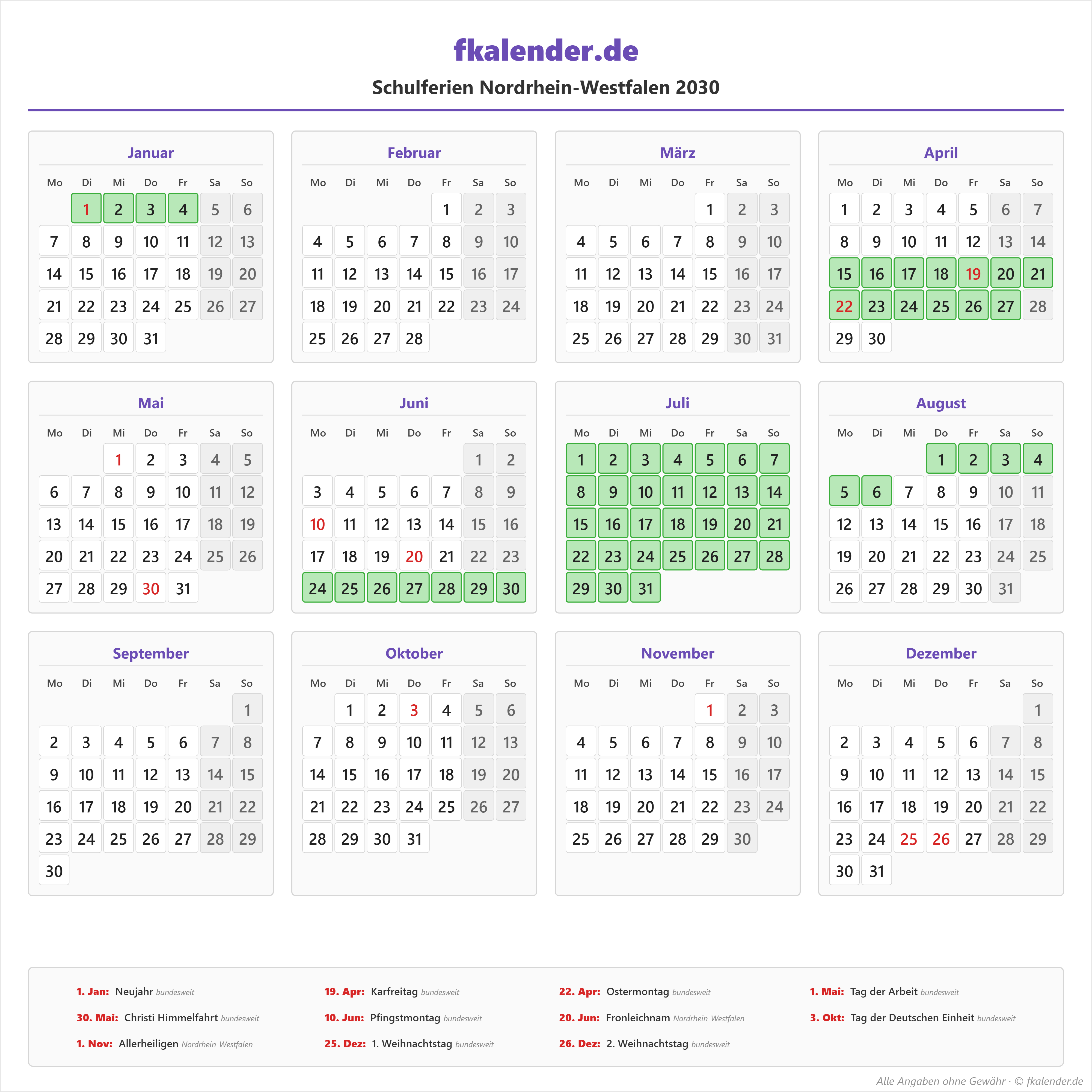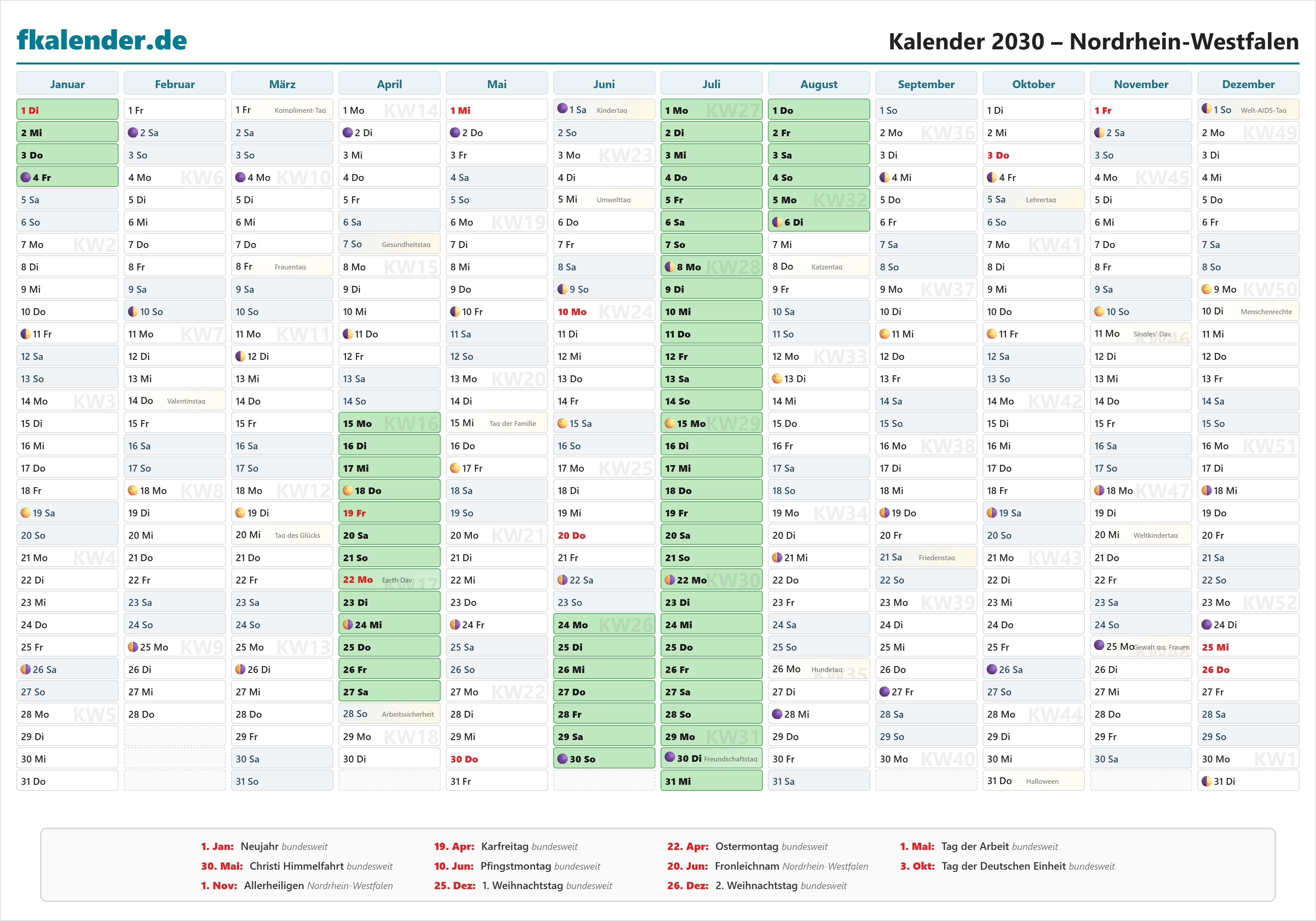 Ferienkalender Nordrhein-Westfalen 2030 herunterladen