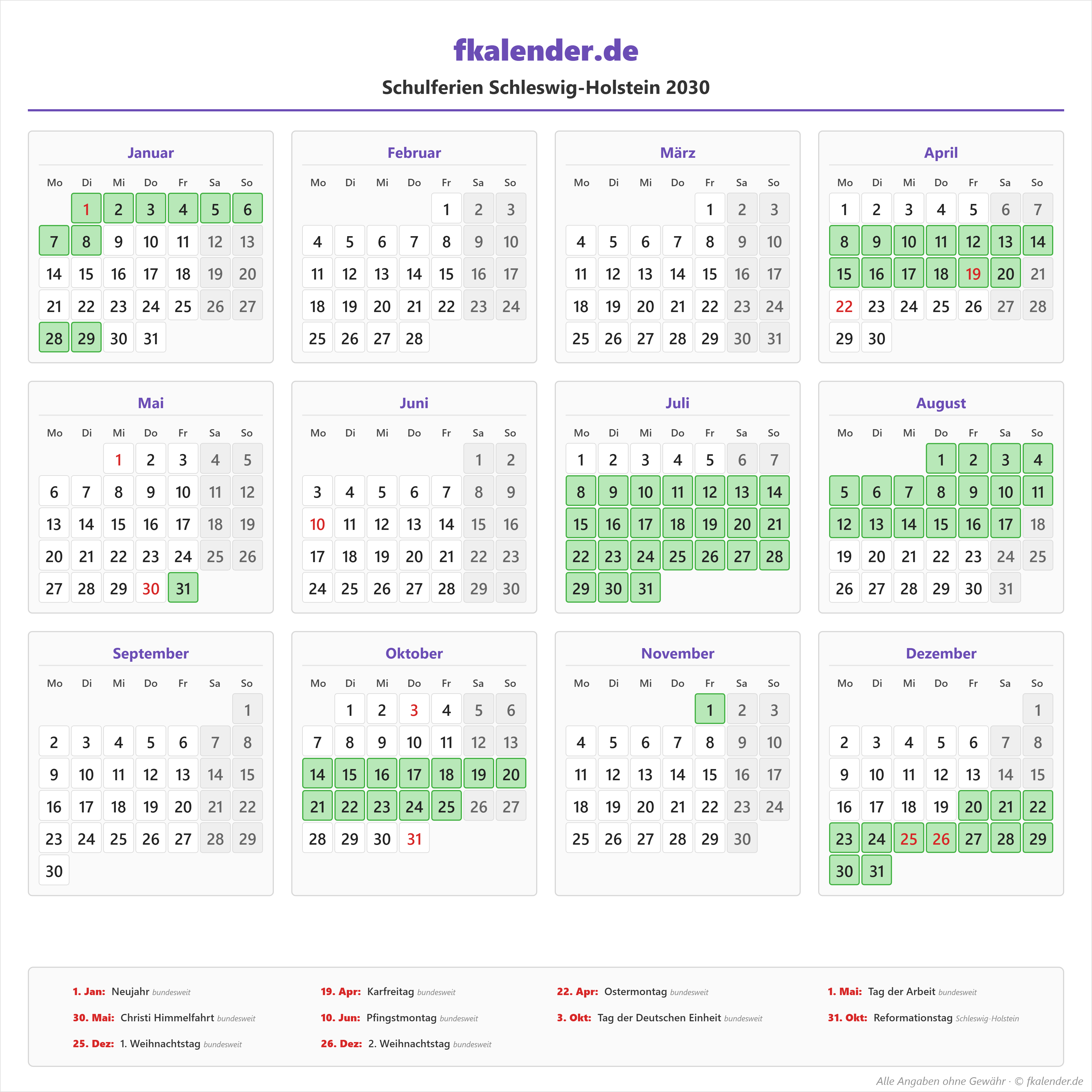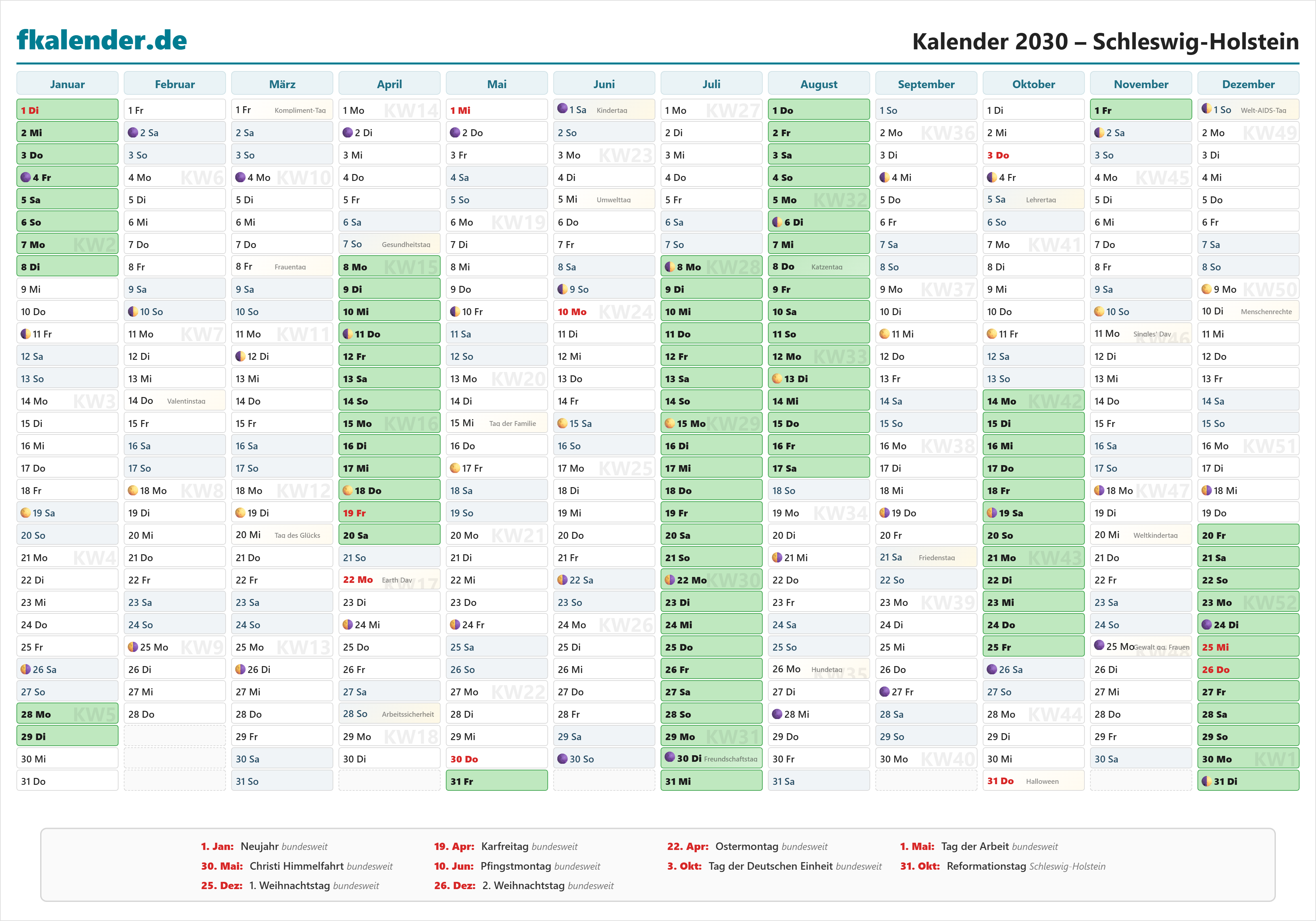 Ferienkalender Schleswig-Holstein 2030 herunterladen