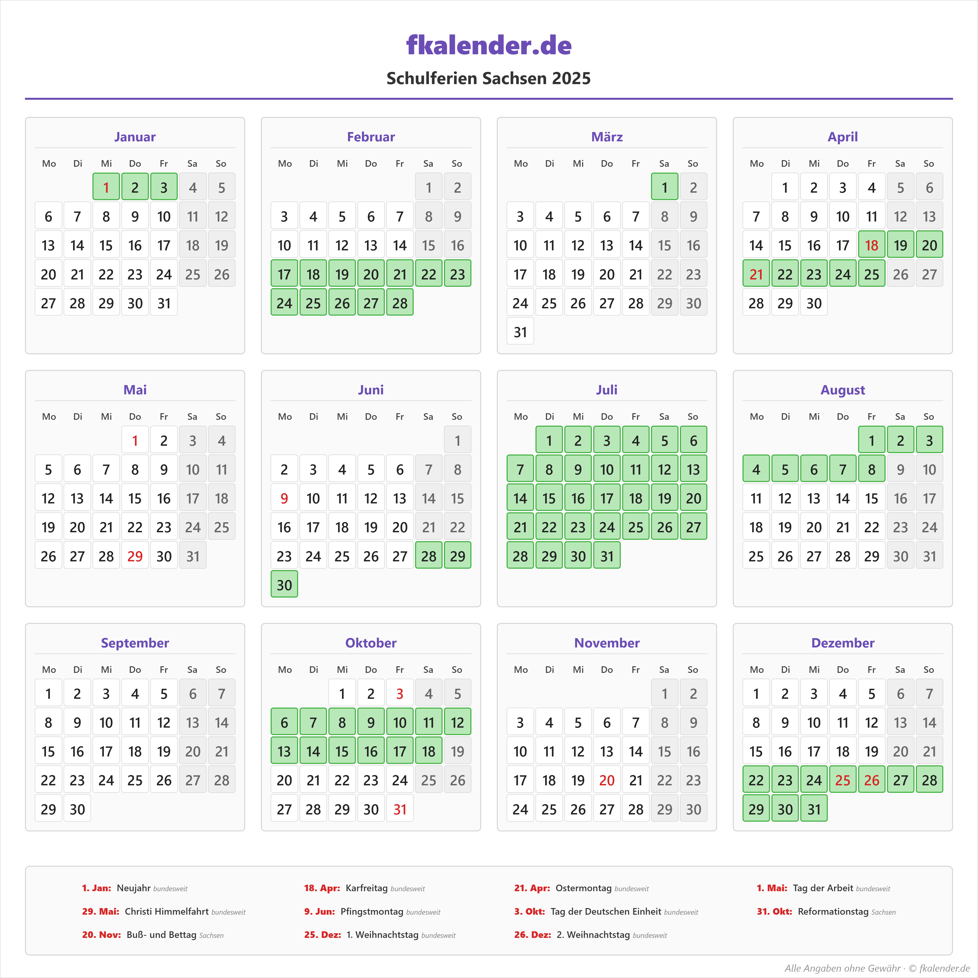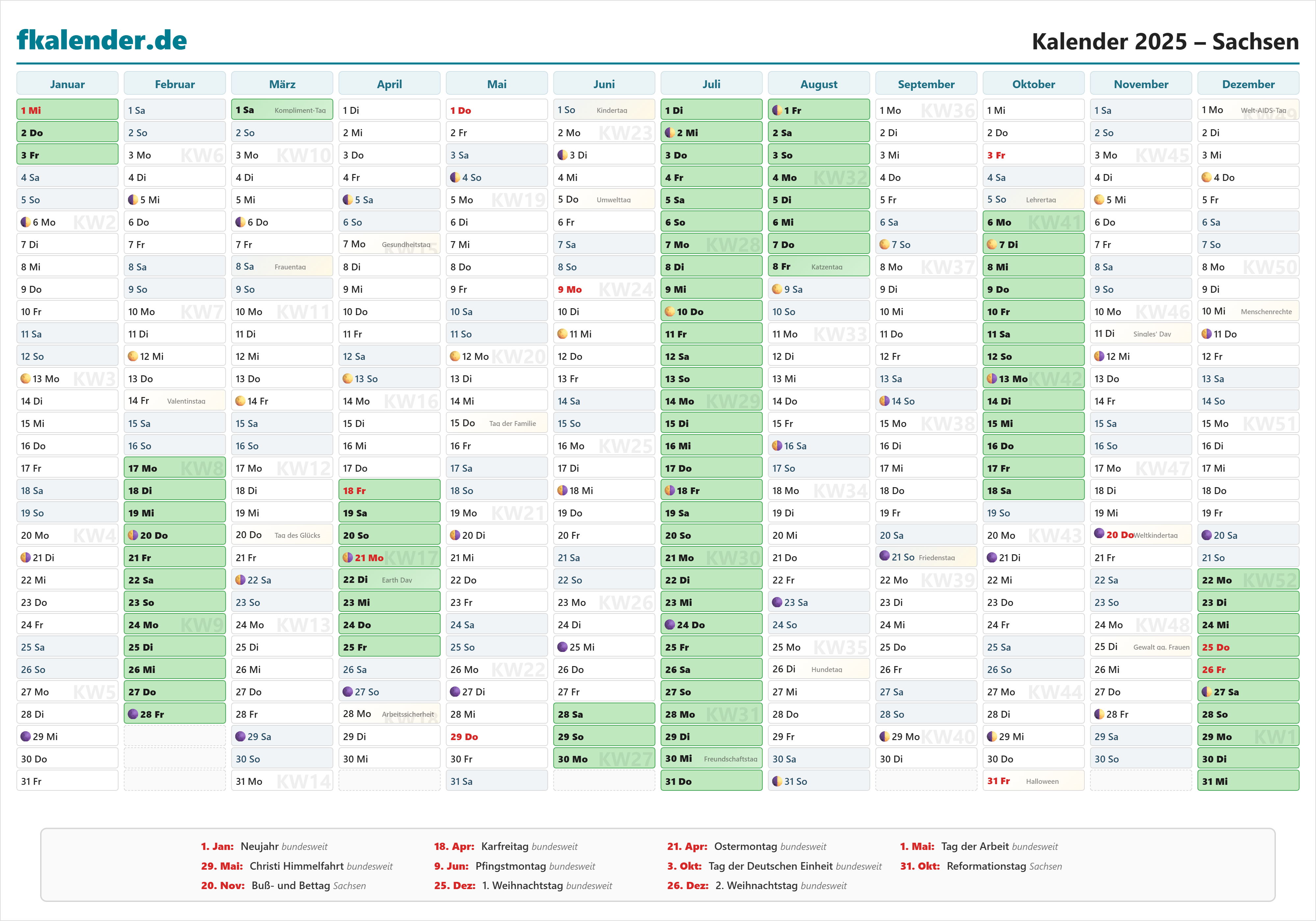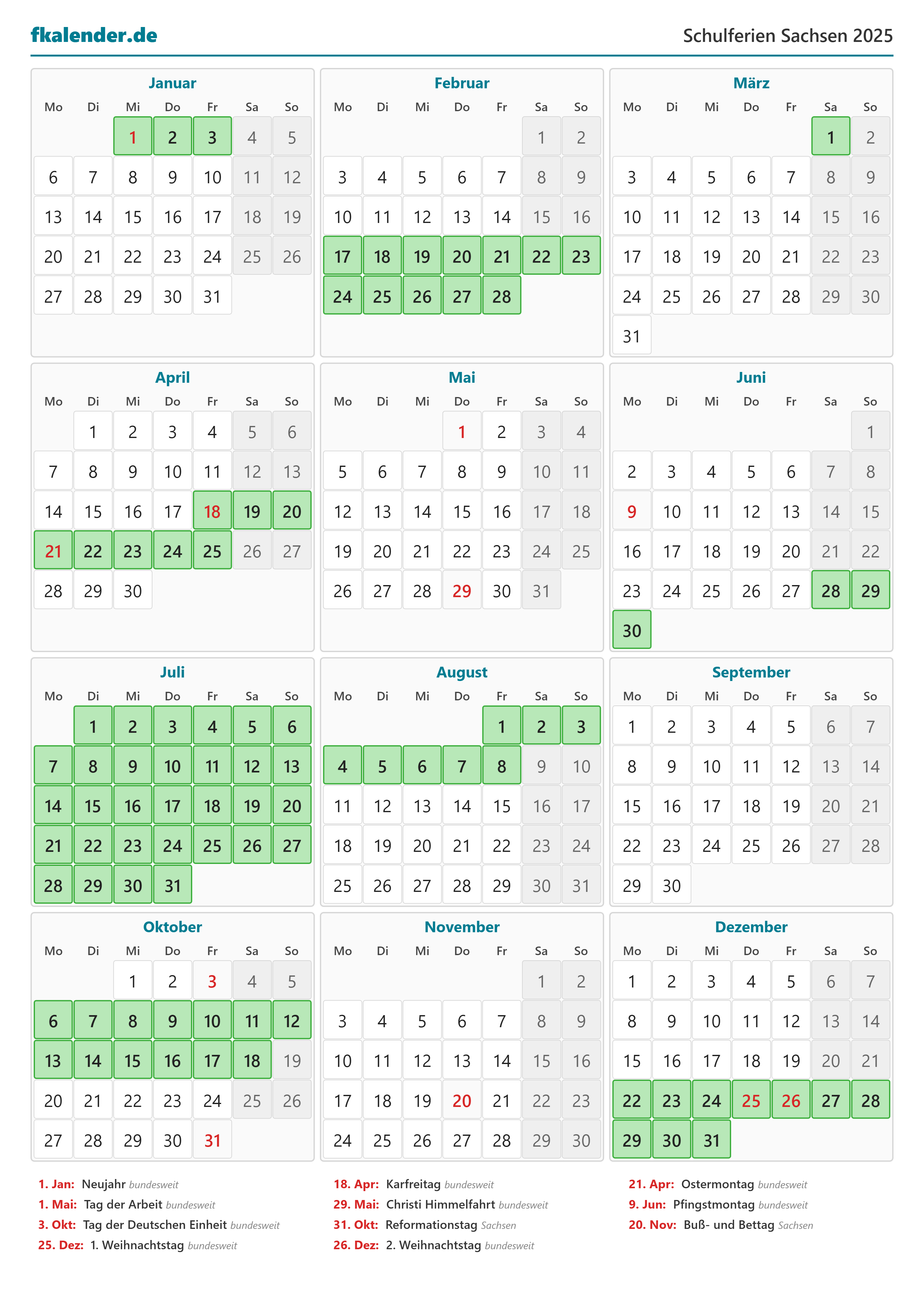 Ferienkalender Sachsen 2025 herunterladen