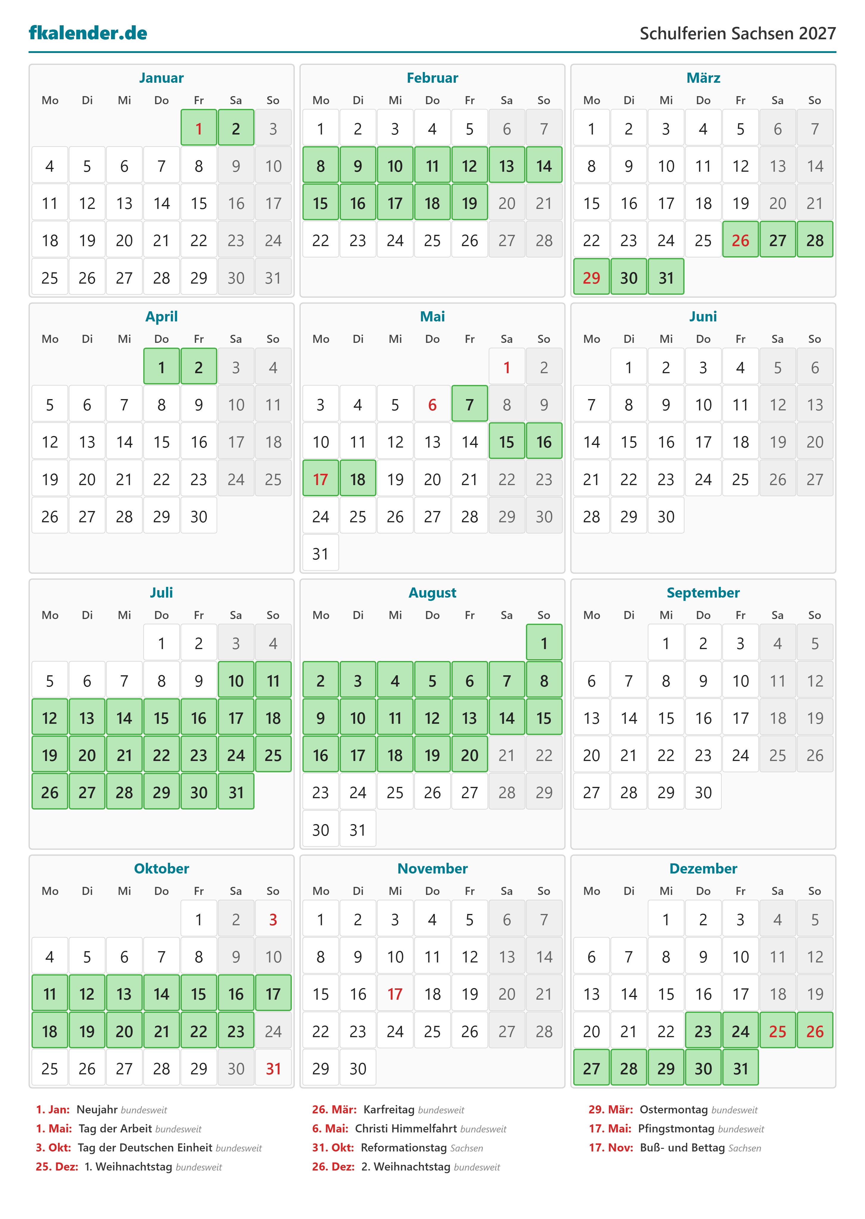 Ferienkalender Sachsen 2027 herunterladen