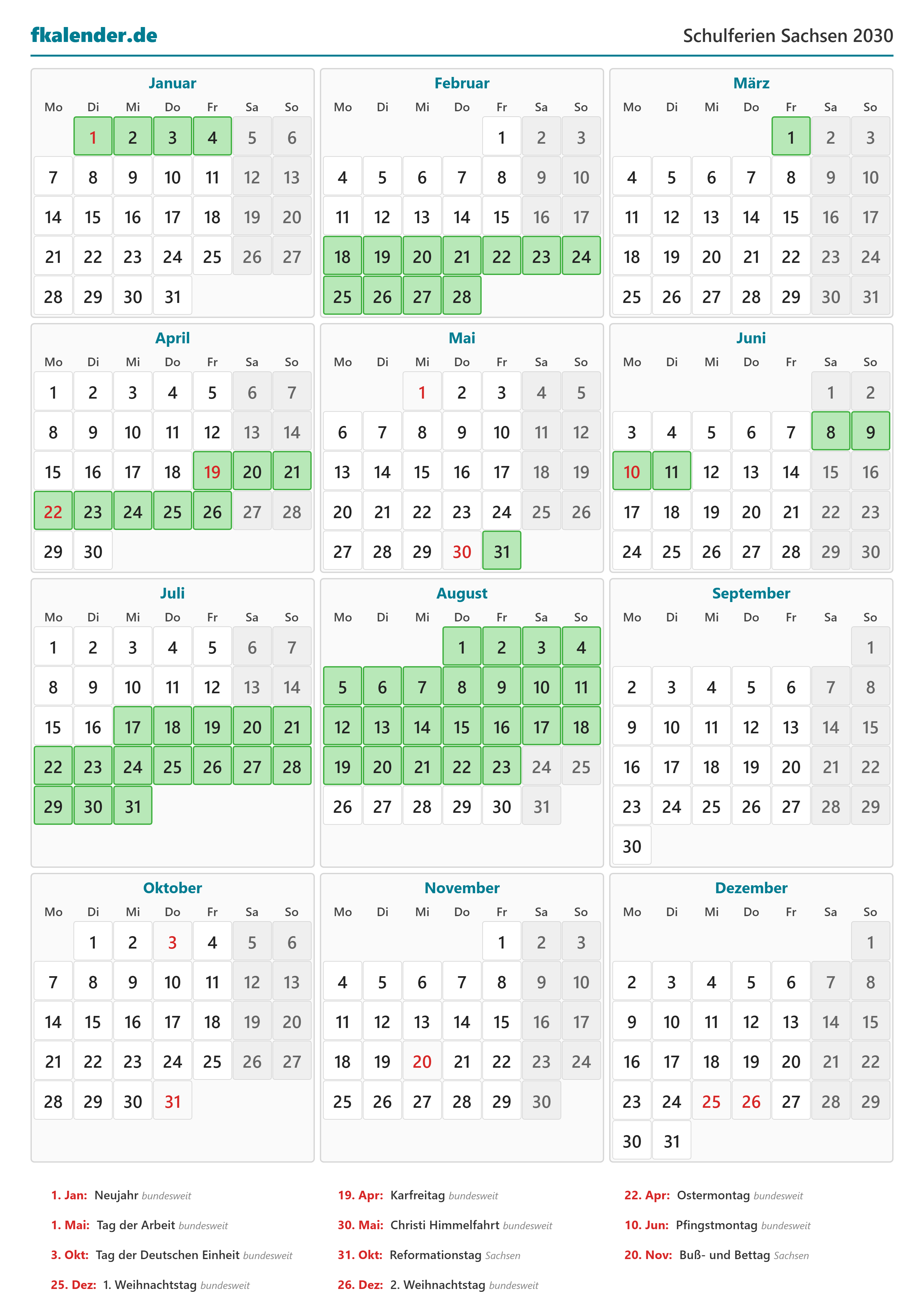Ferienkalender Sachsen 2030 herunterladen