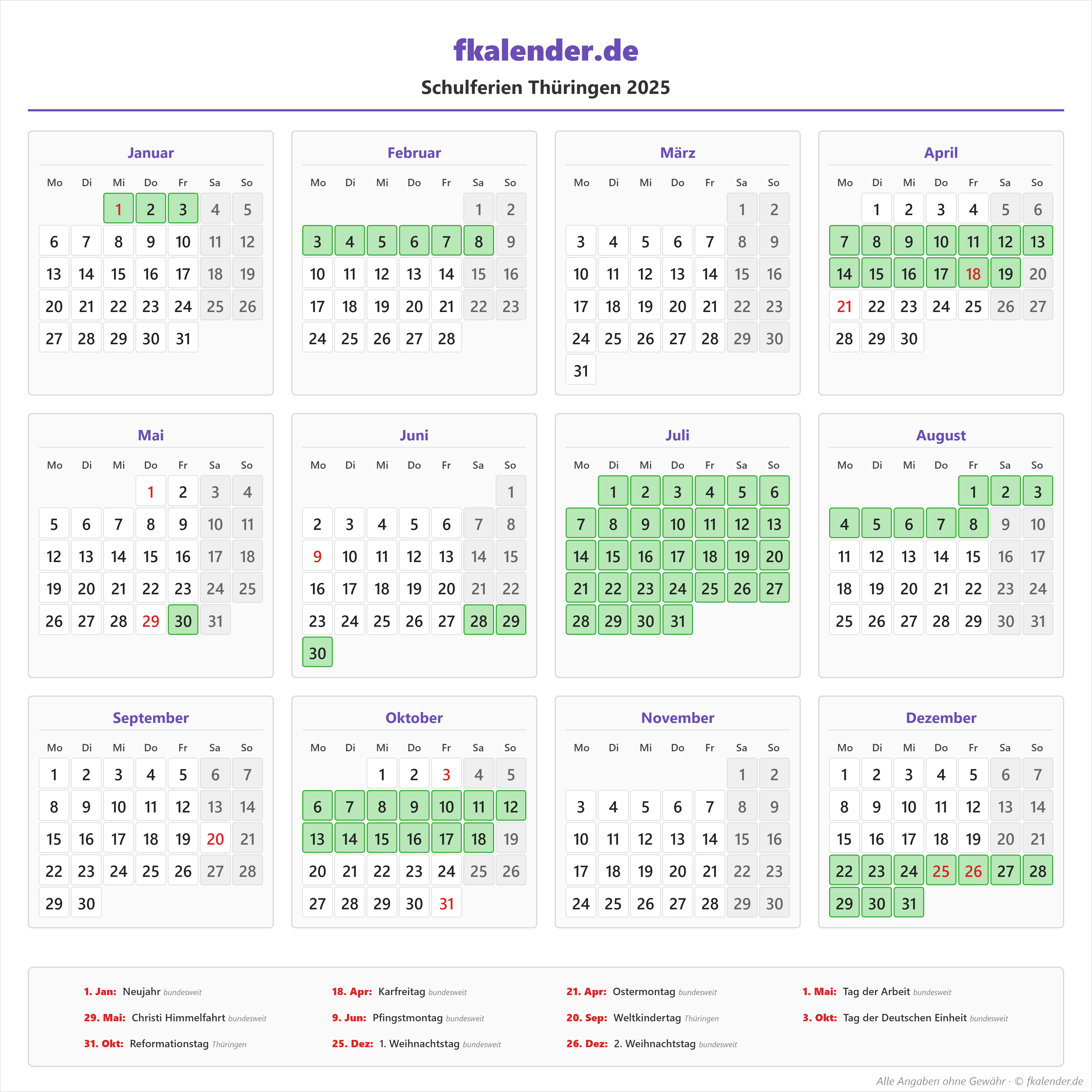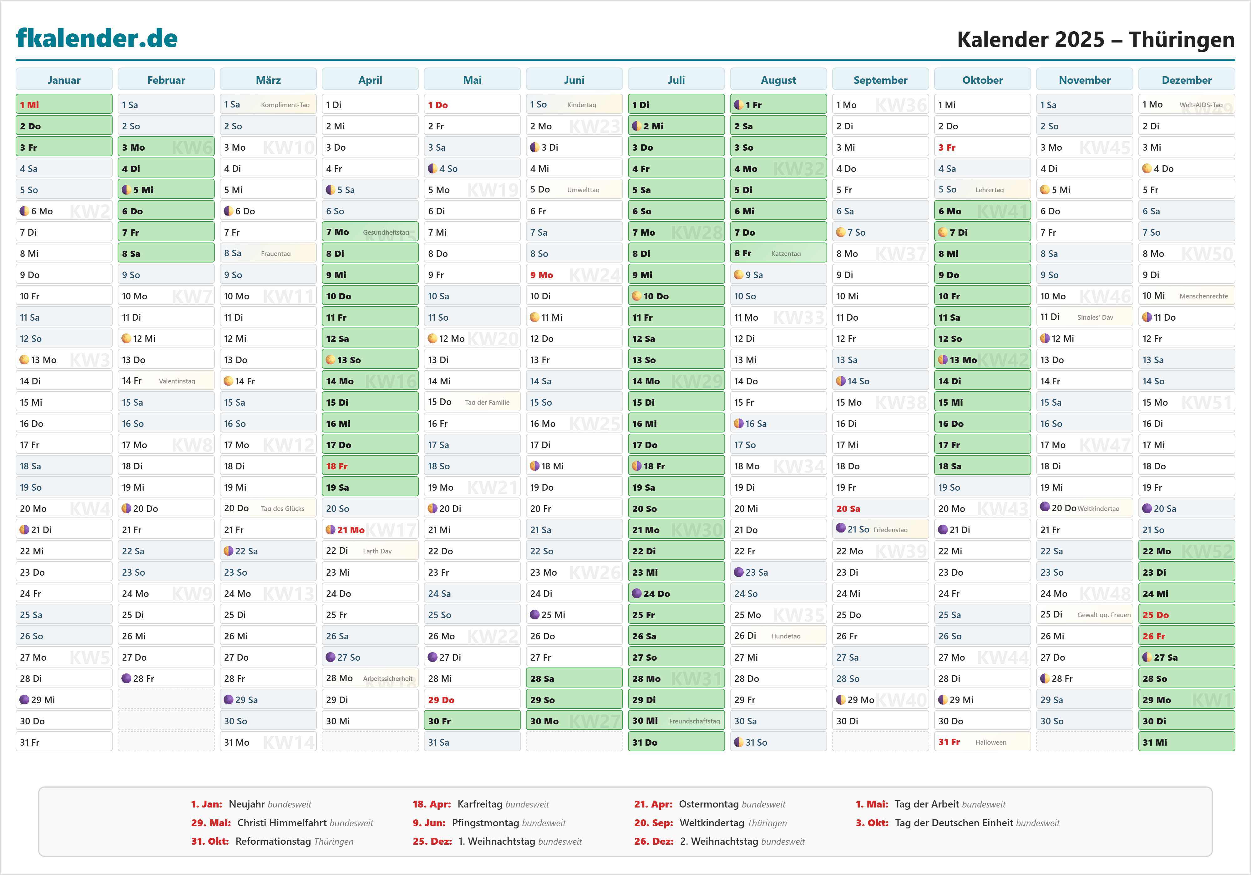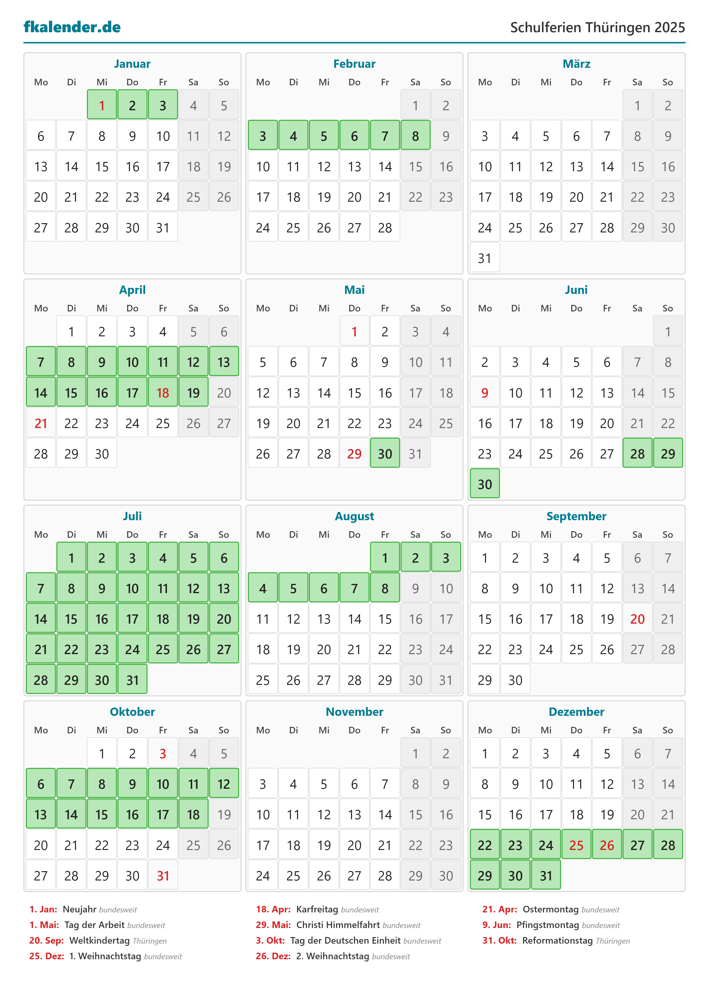 Ferienkalender Thüringen 2025 herunterladen