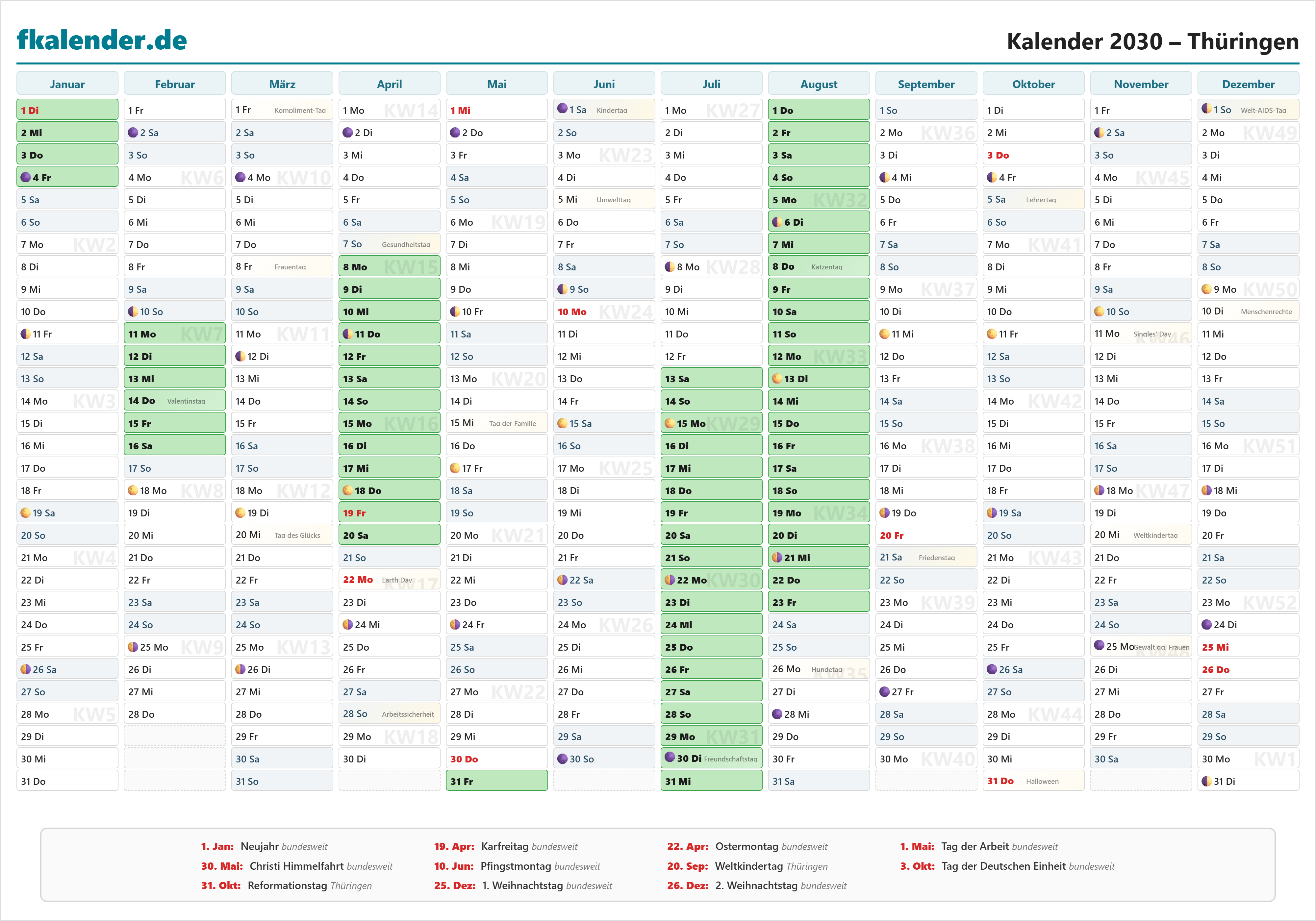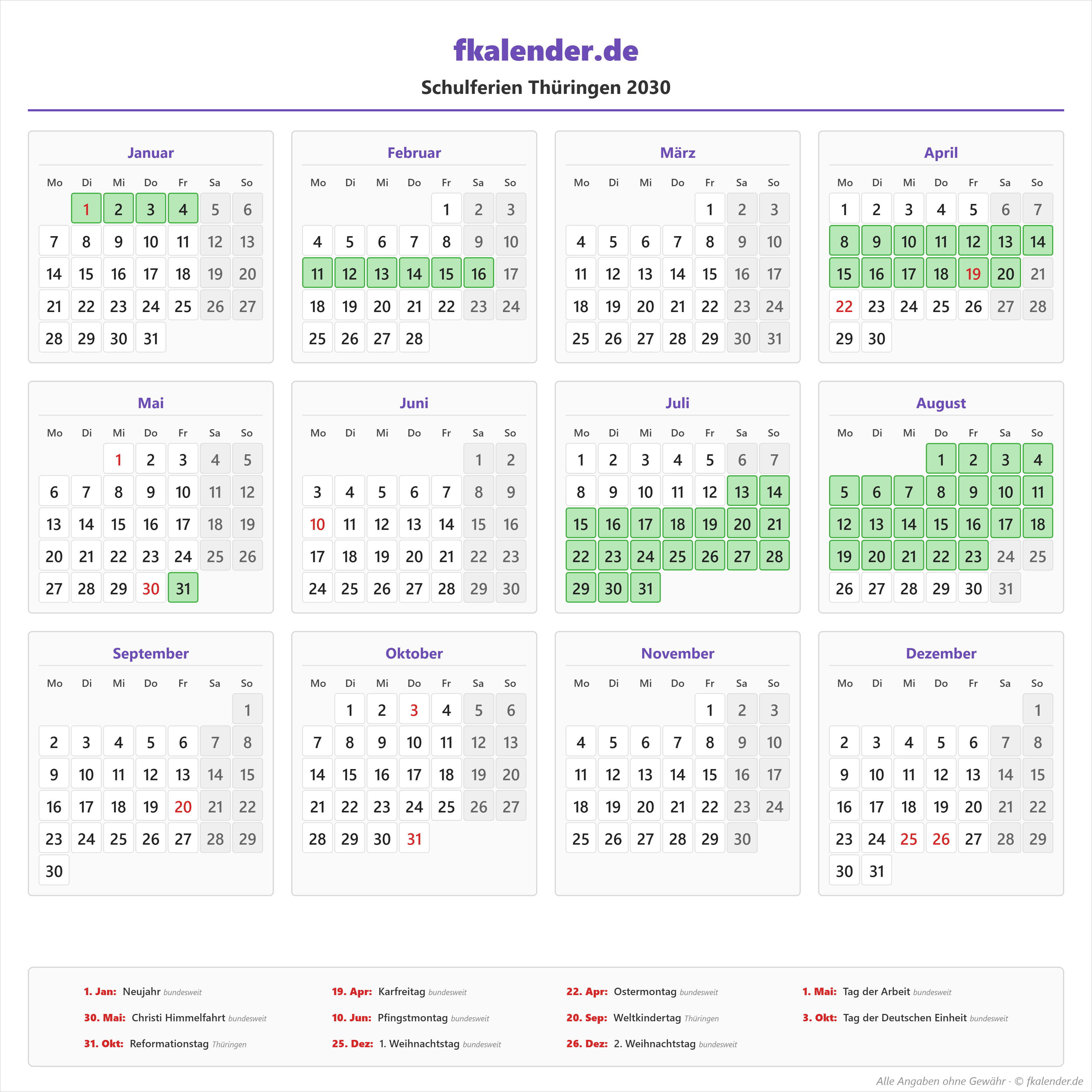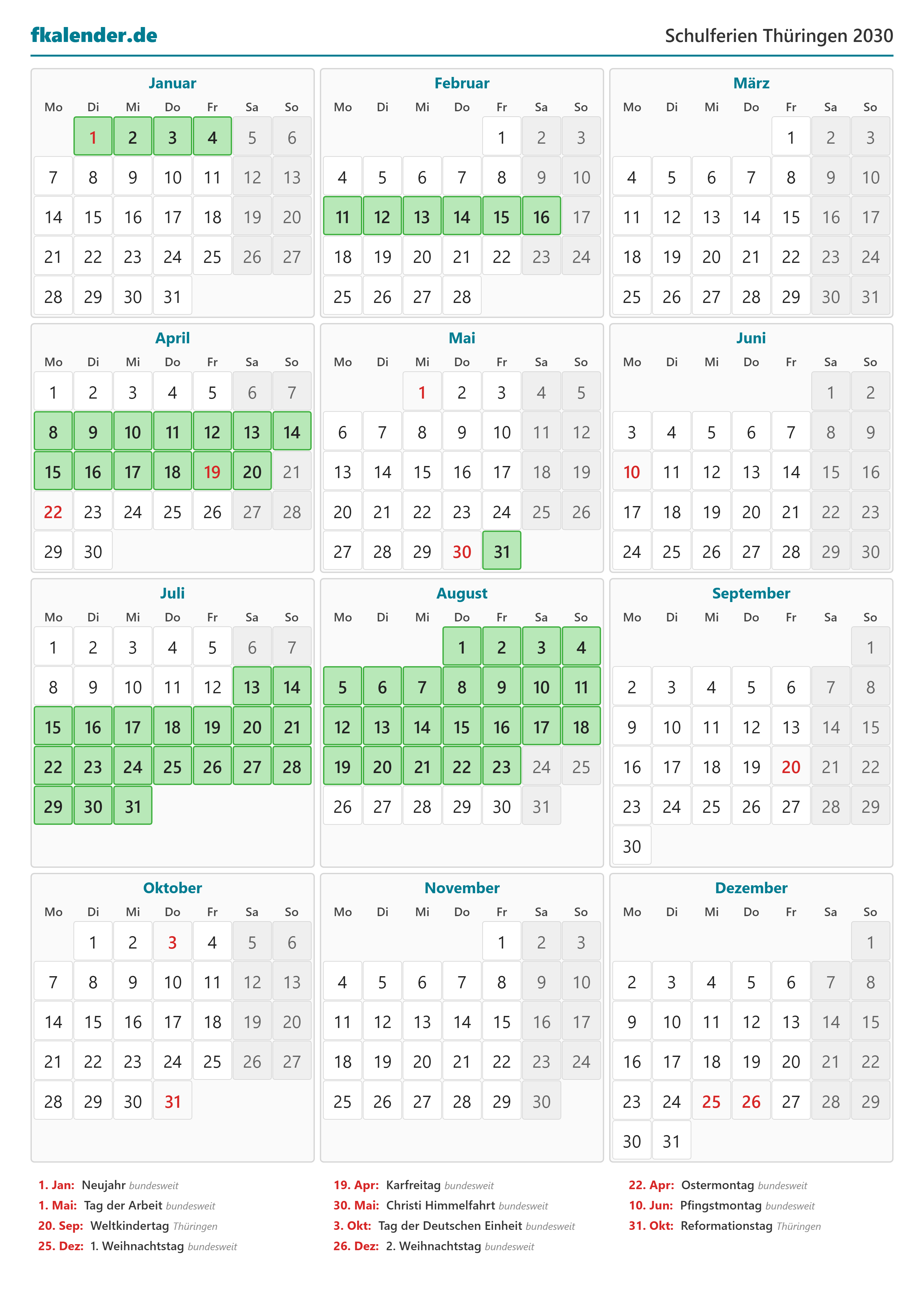 - Sommerferien: 13.07.2030 - 23.08.2030